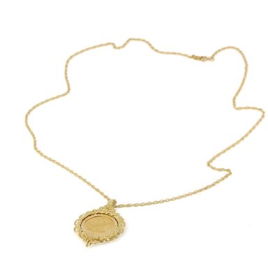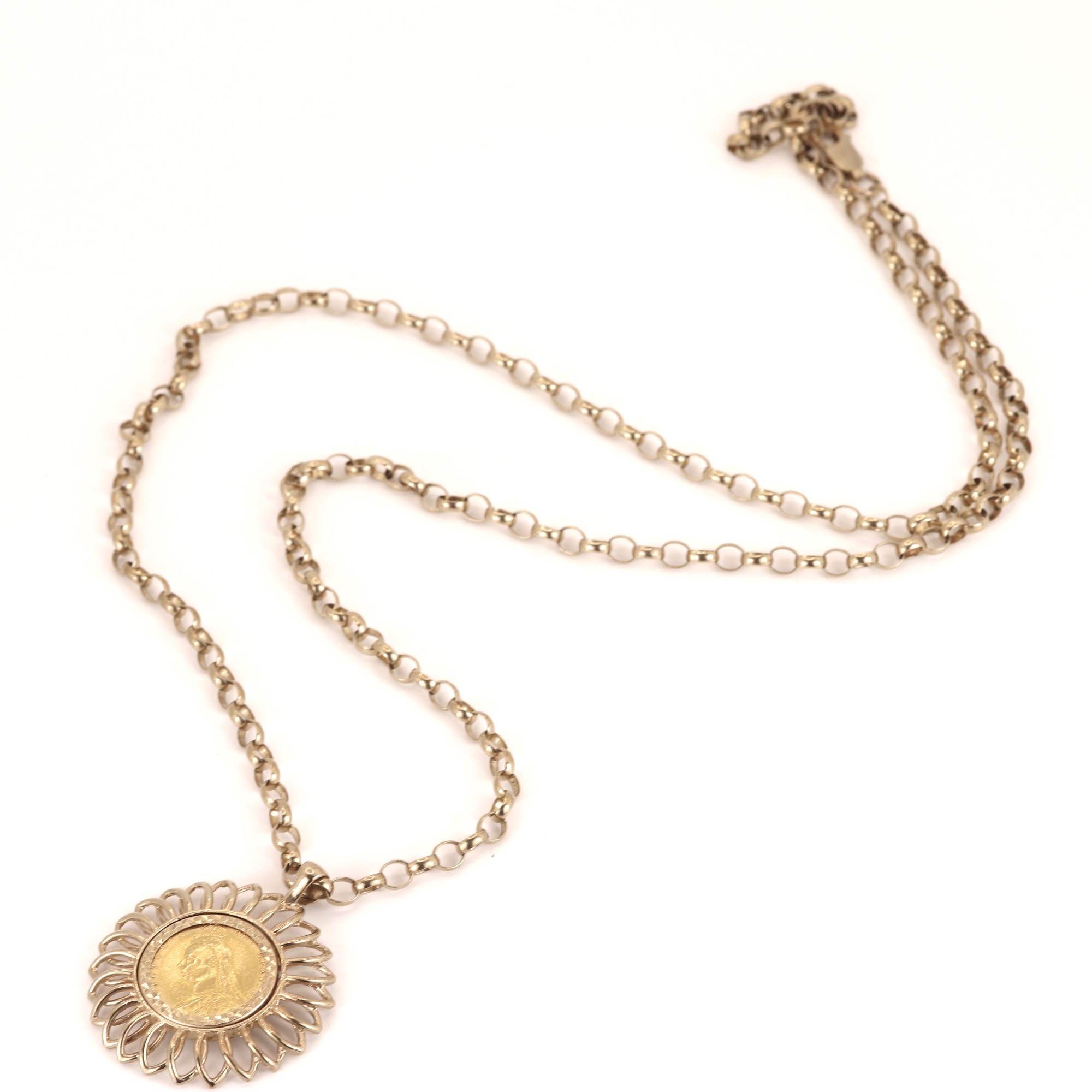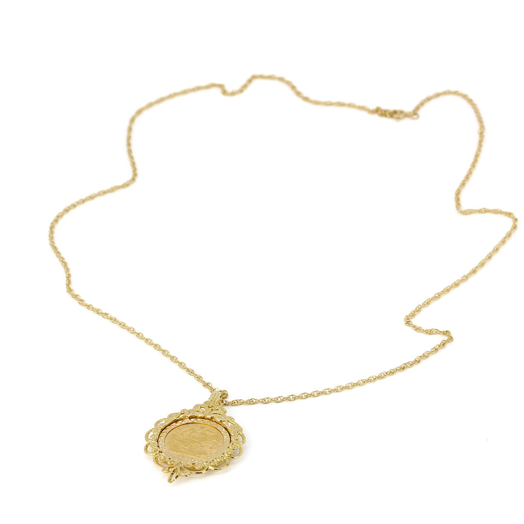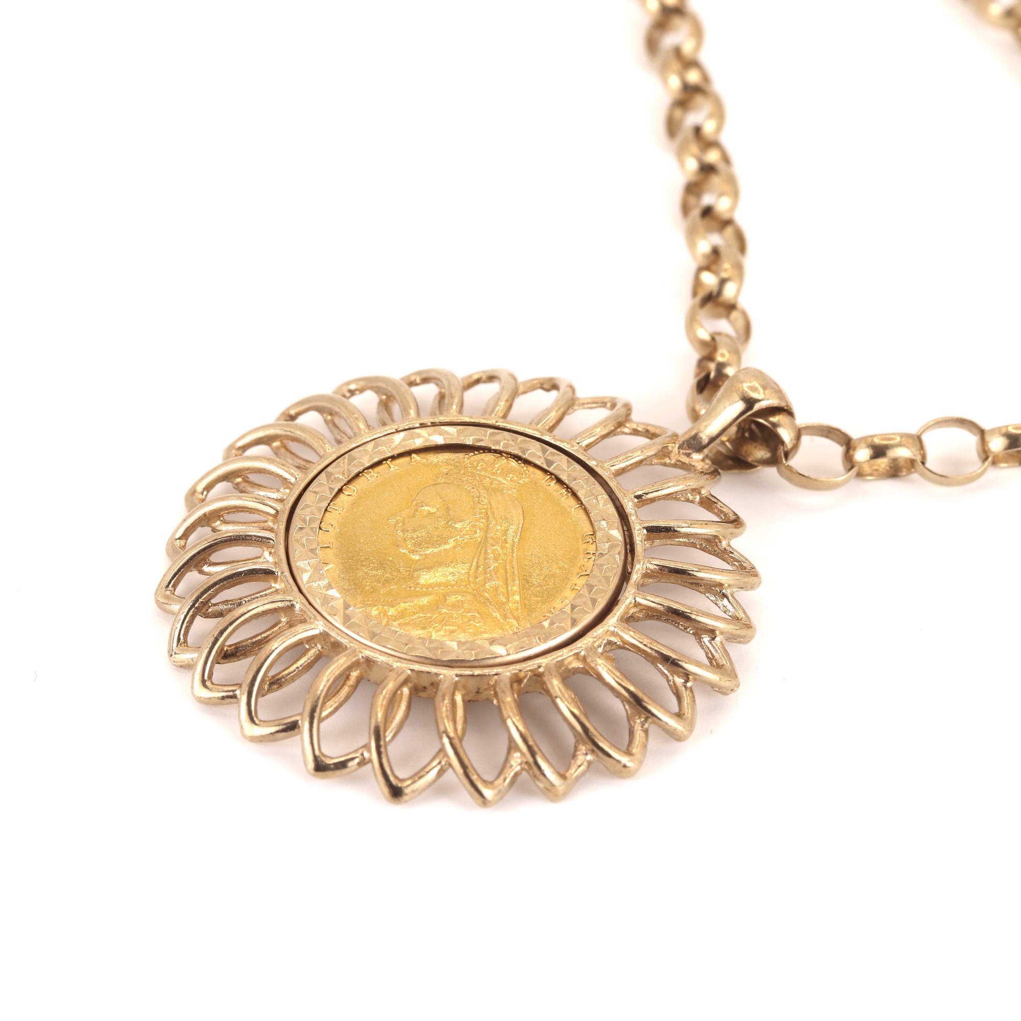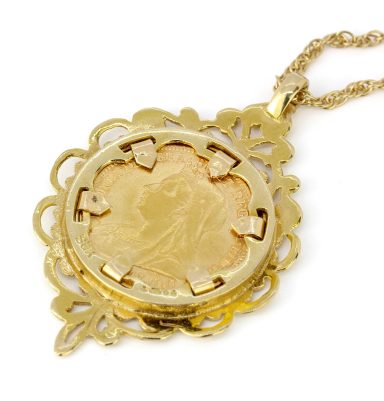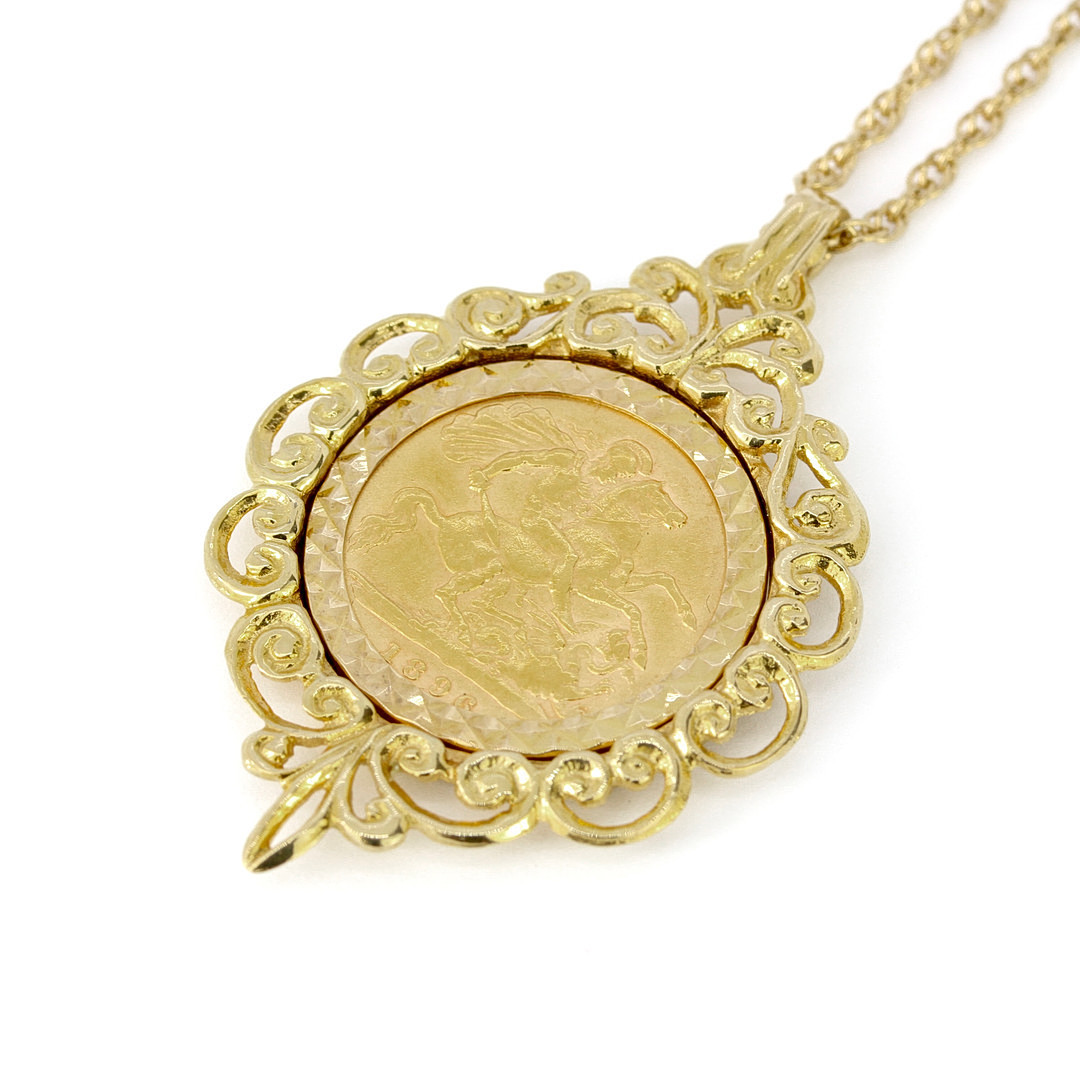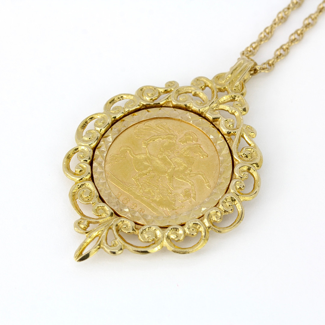 A 22ct yellow gold Victoria Full Sovereign coin 1896 in 9ct yellow gold cast on 9ct yellow gold chain. Chain length: 62cm. Cast size: 4,2cm x 2.8cm.