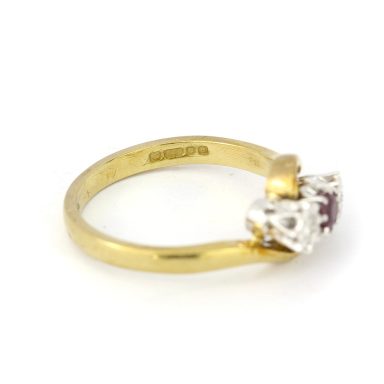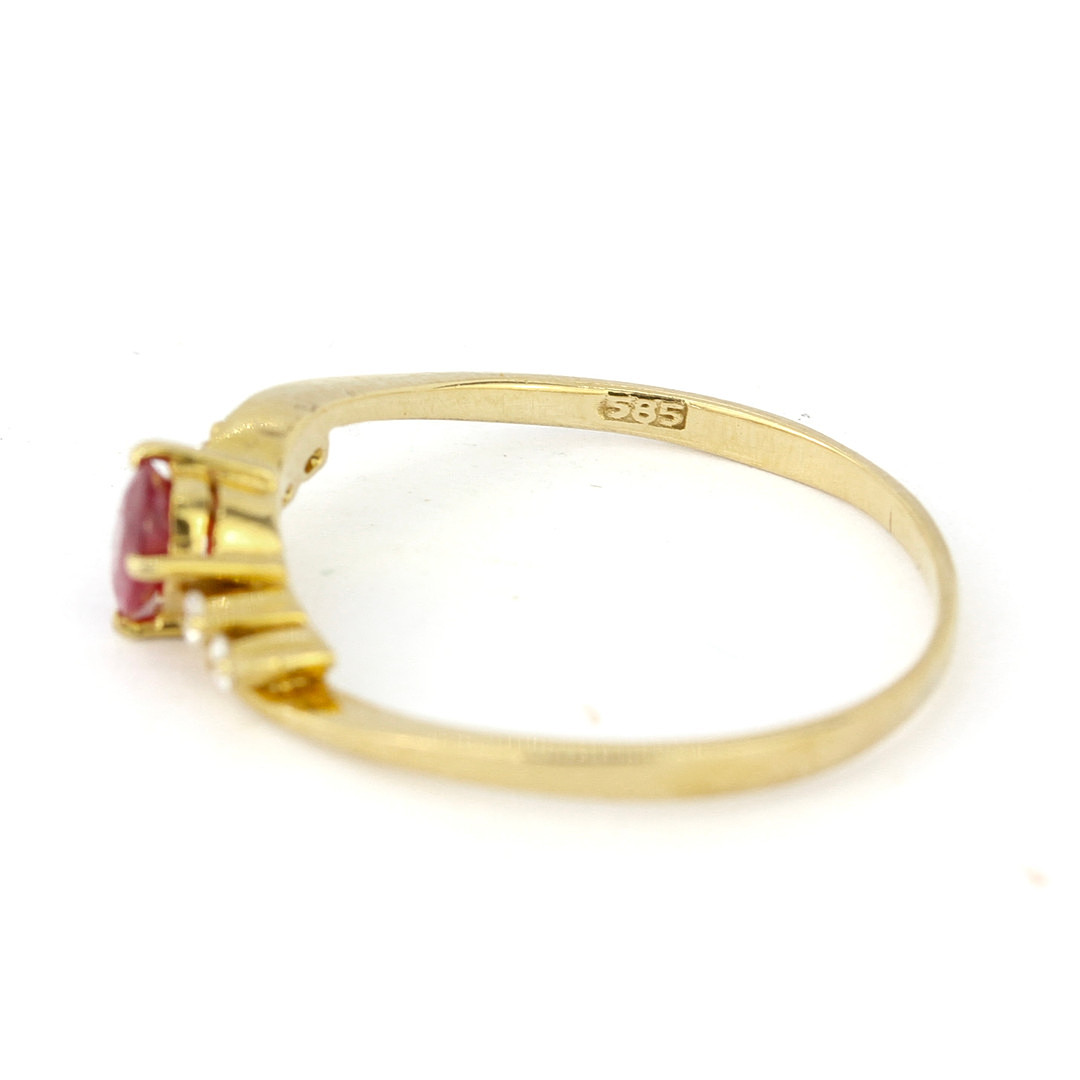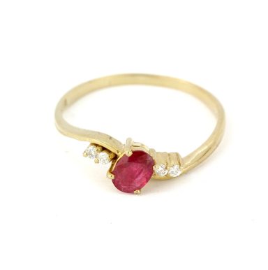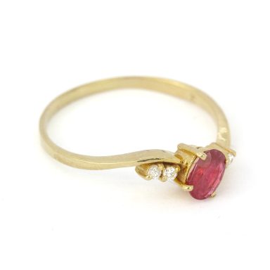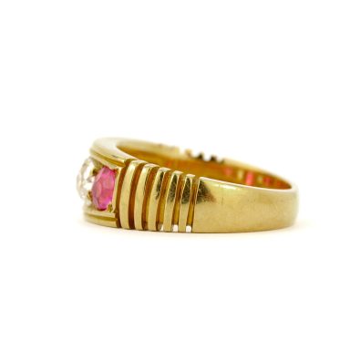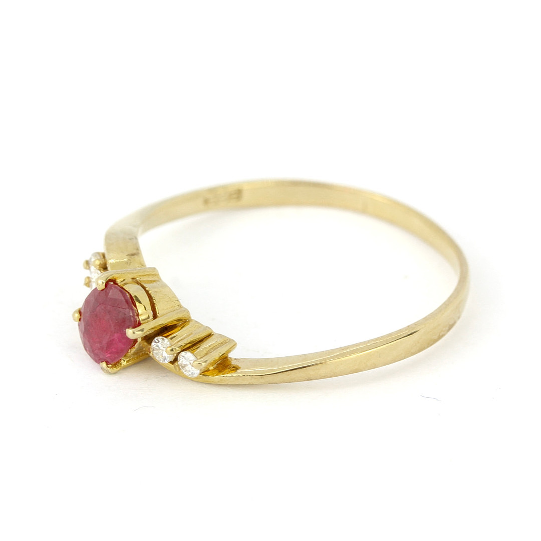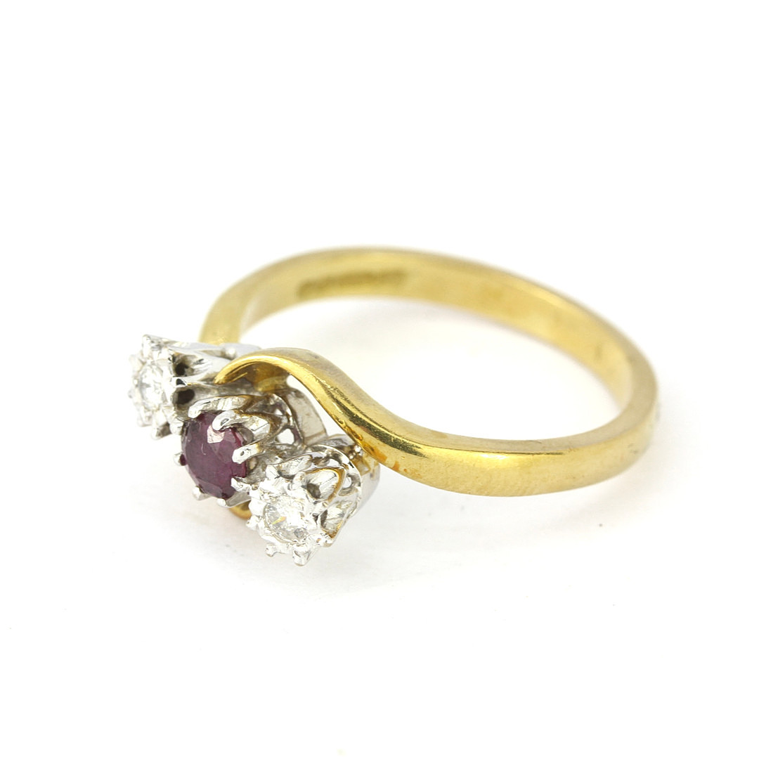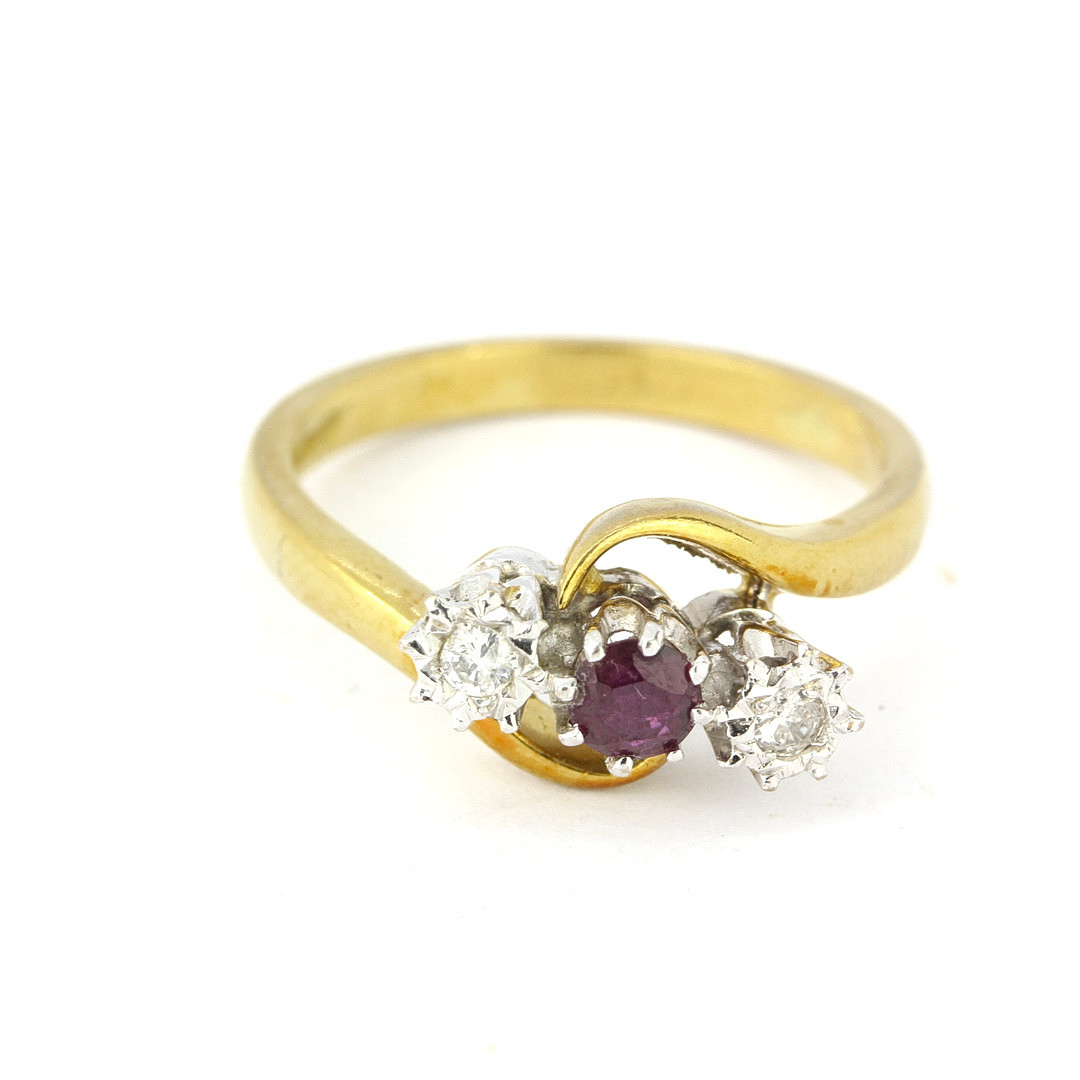 An 18ct yellow gold ring set with ruby and two diamonds. UK ring size: O,5. Total weight: 4.7g.