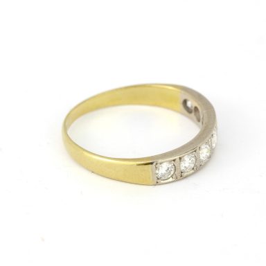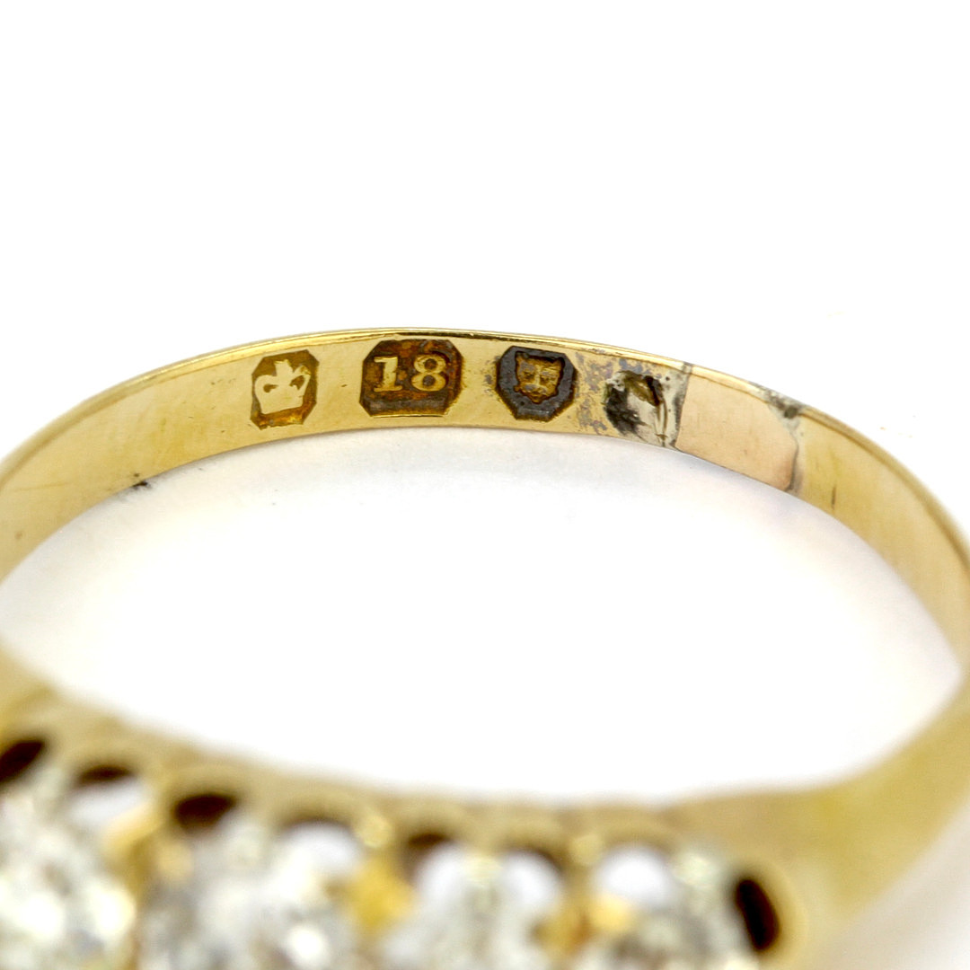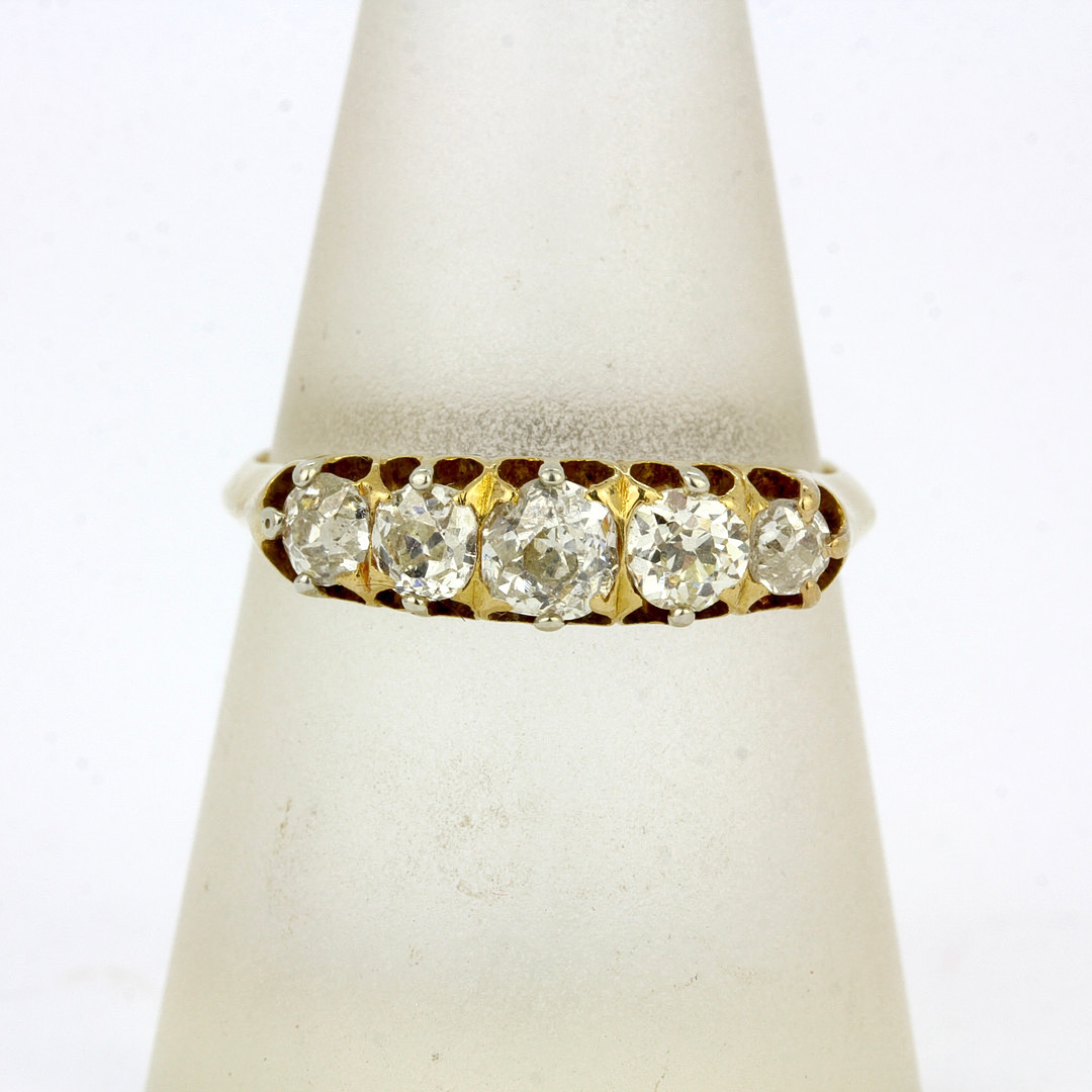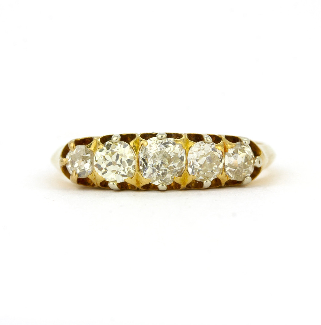 An 18ct yellow gold five stone ring set with old cut diamonds (approx. 1ct). UK ring size: Q. Total weight: 3,7g.