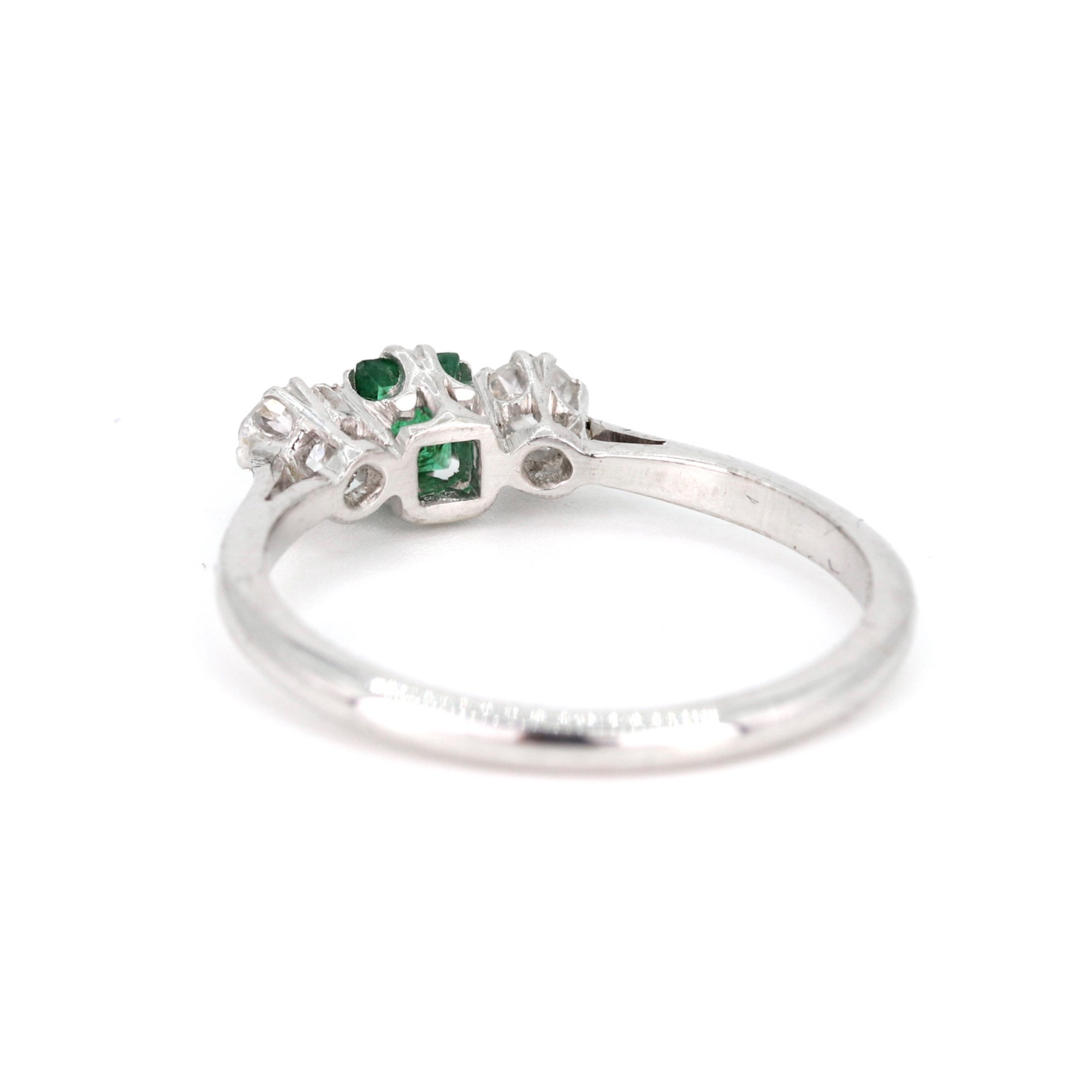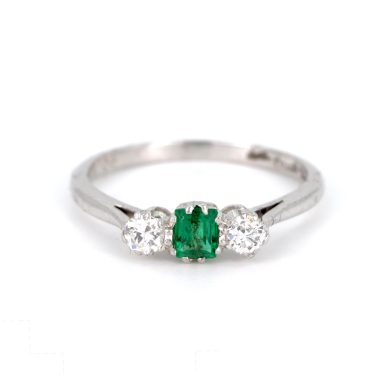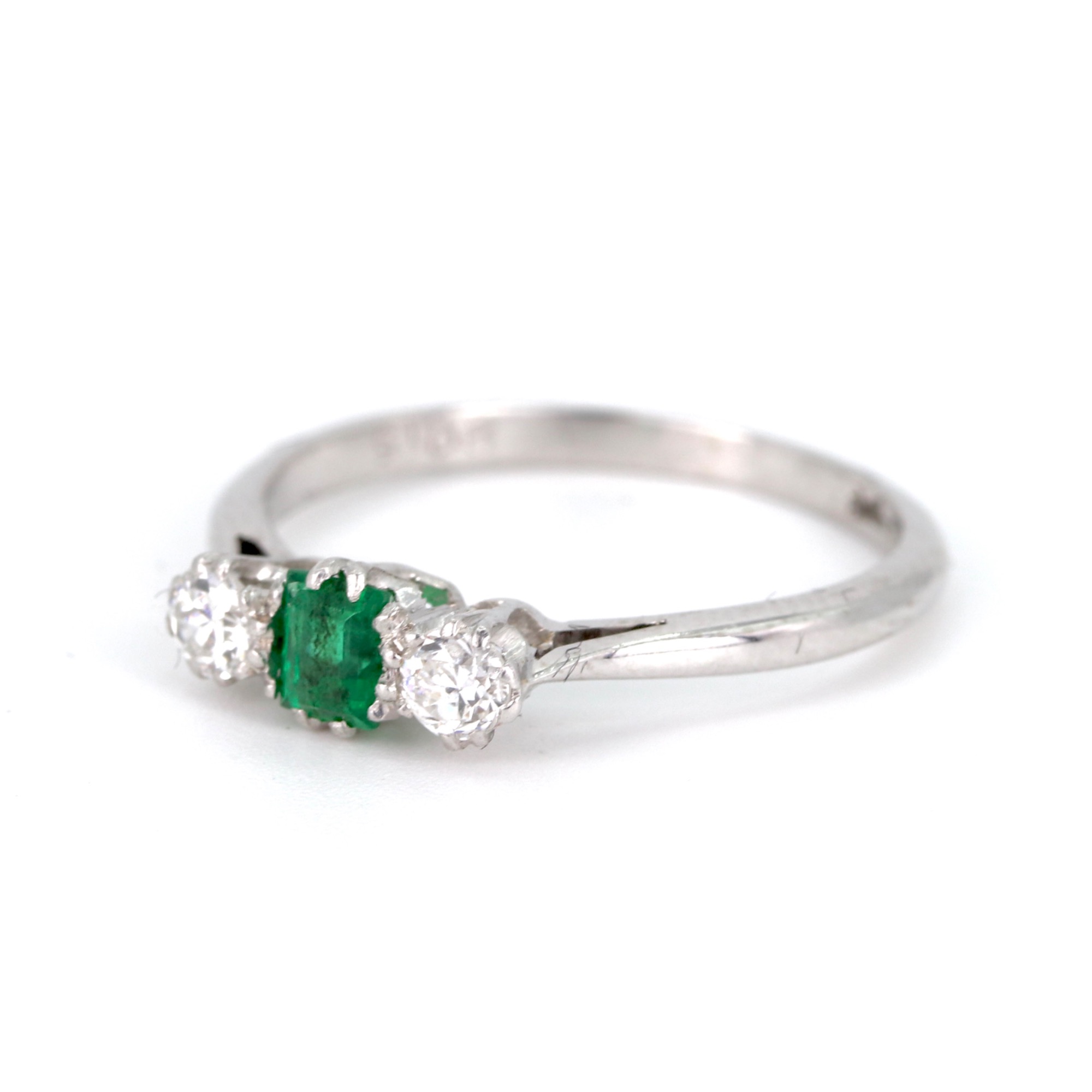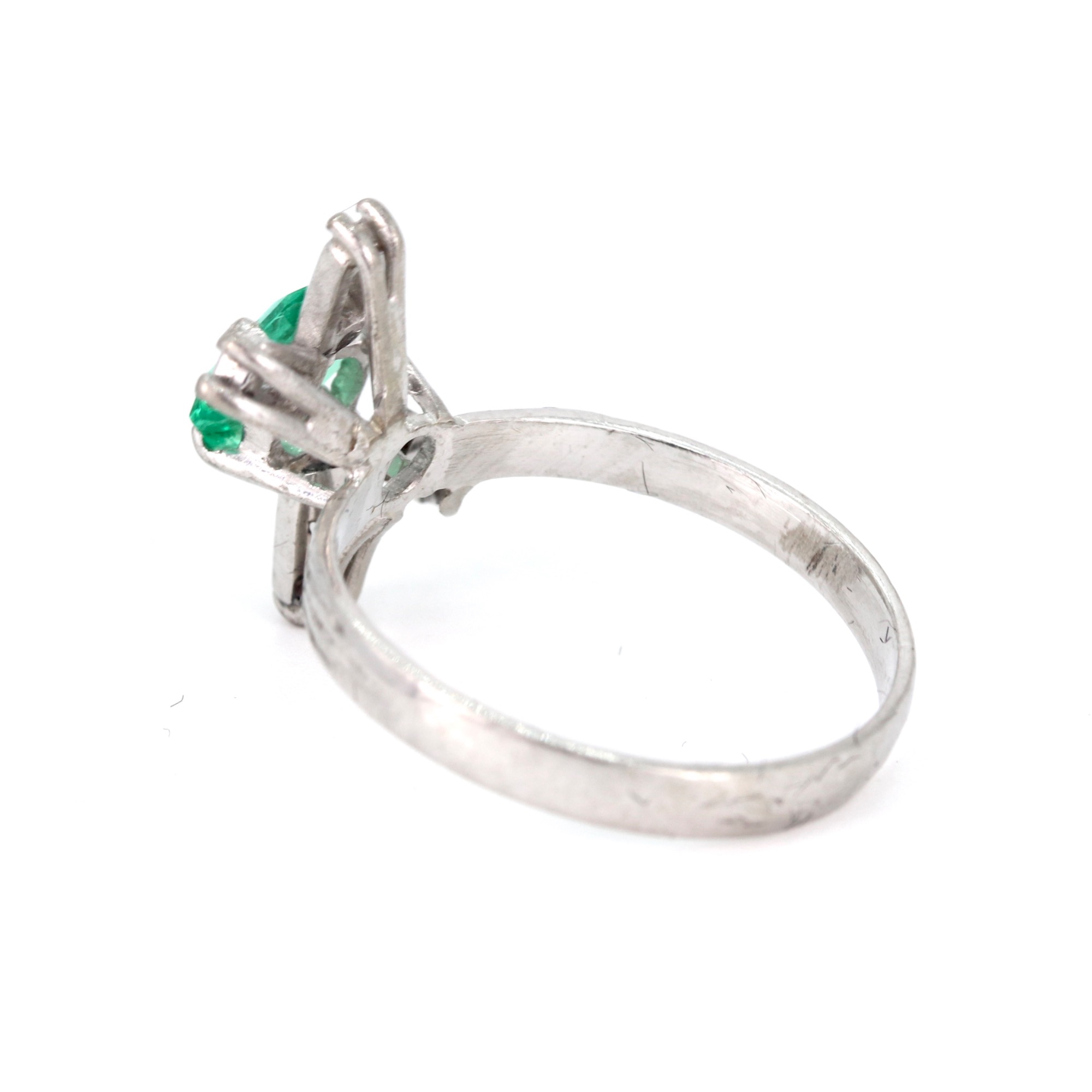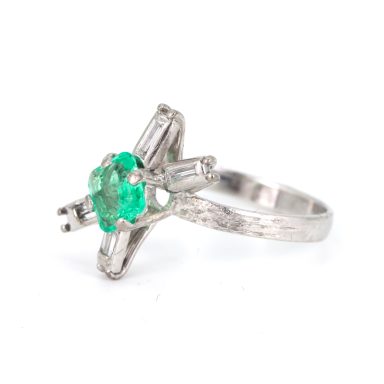 An 18K white gold ring set with round cut emerald and diamonds to the side.