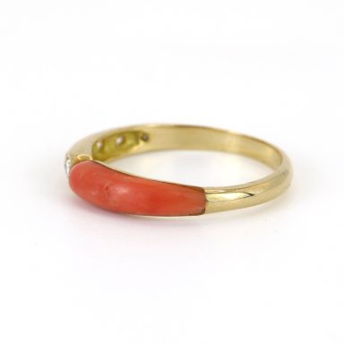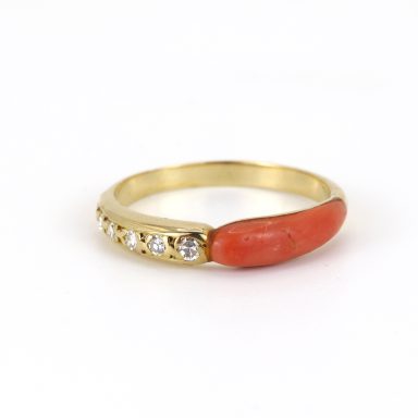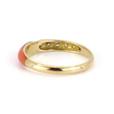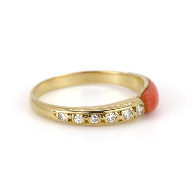 An 18K yellow gold ring set with coral and diamonds. UK ring size: P.