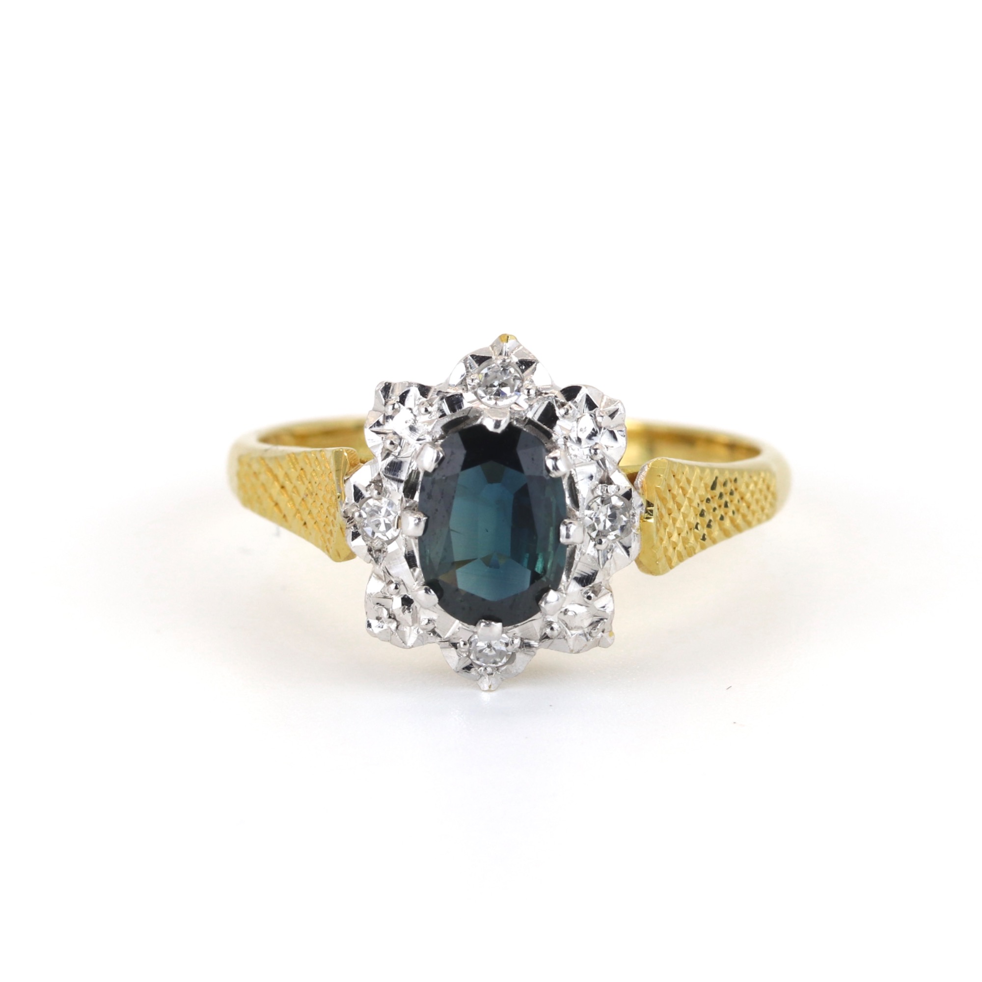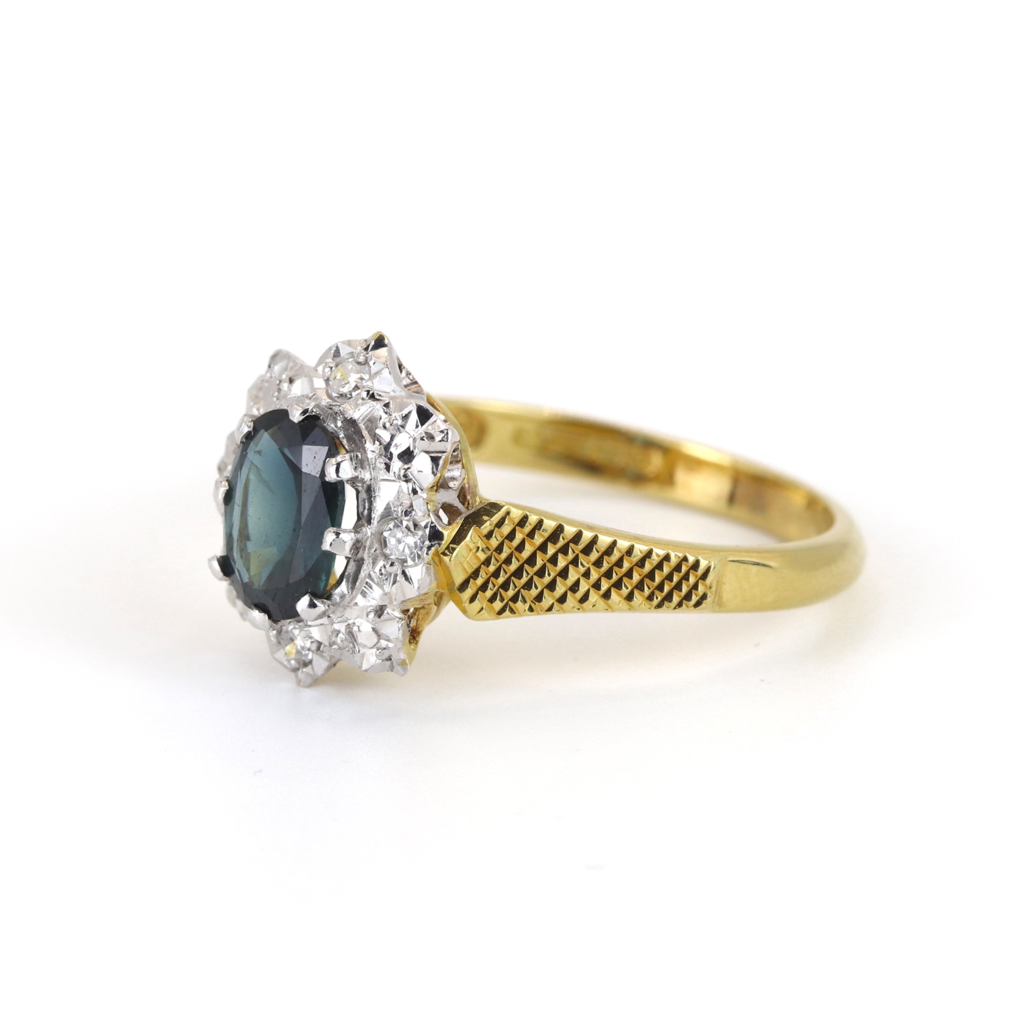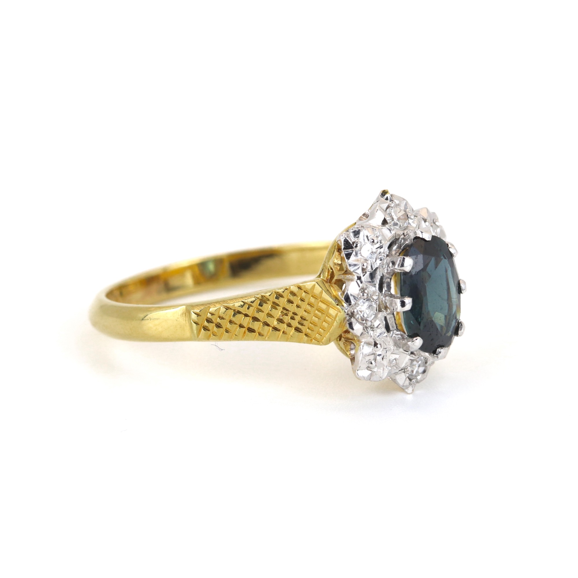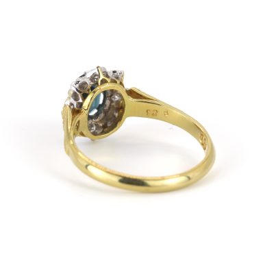 An 18K yellow gold cluster ring set with oval cut teal sapphire surrounded by diamonds.