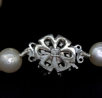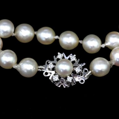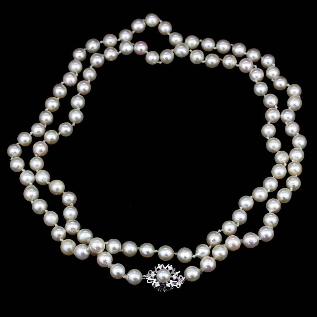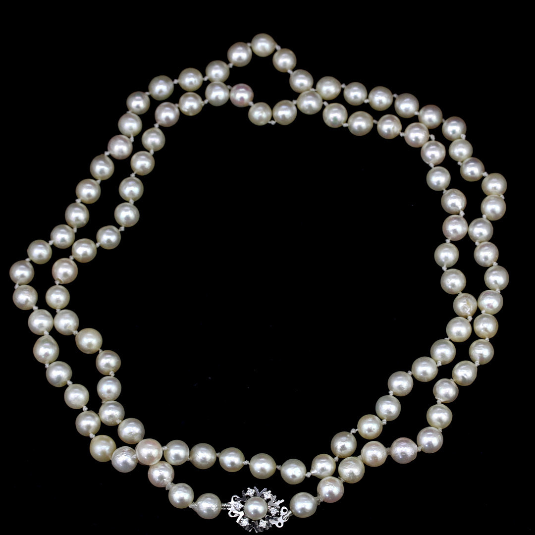 A string of one hundred Akoya pearls with 18ct white gold clasp set with diamonds (0.20ct).Length: 102cm. WGI certificate included.