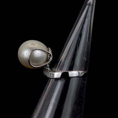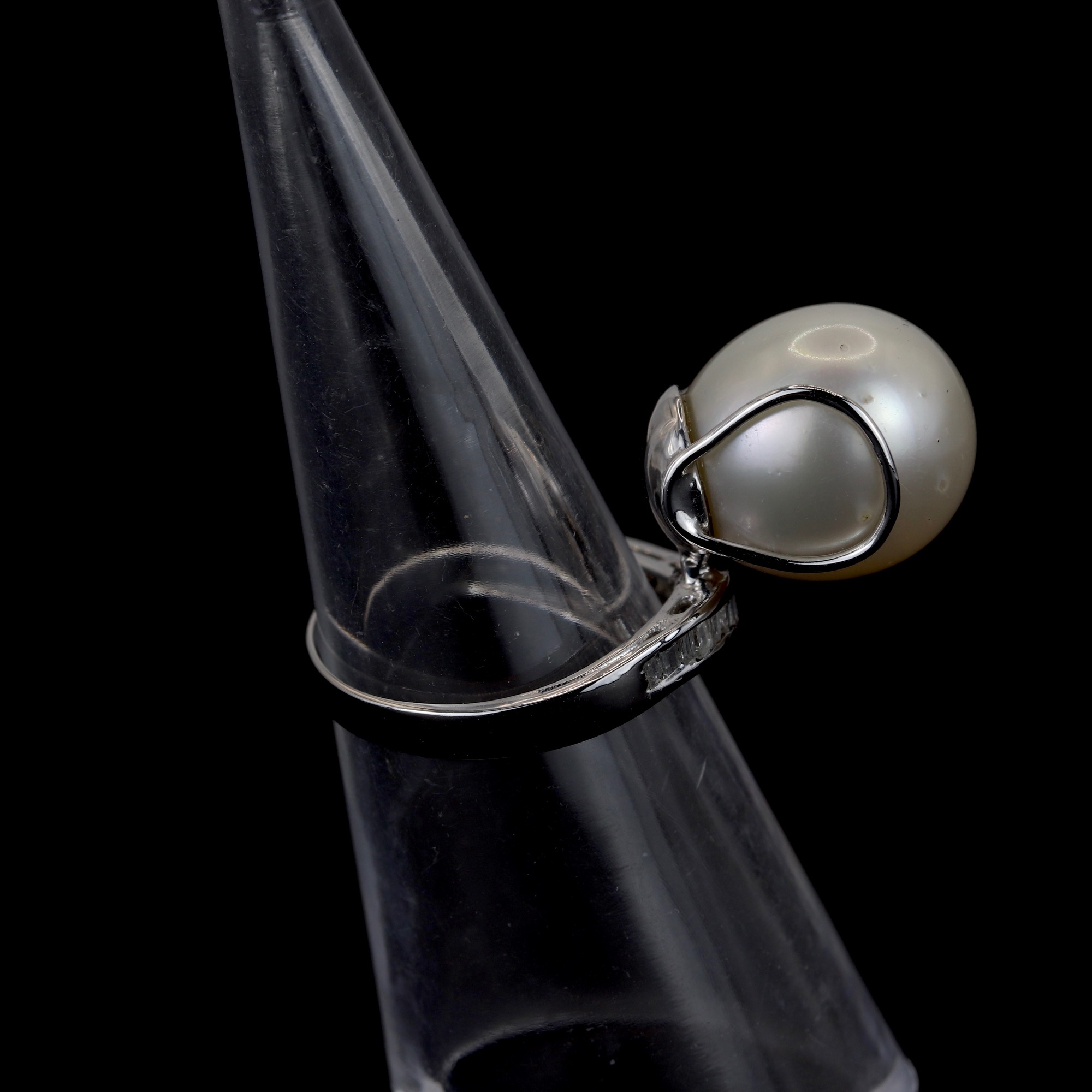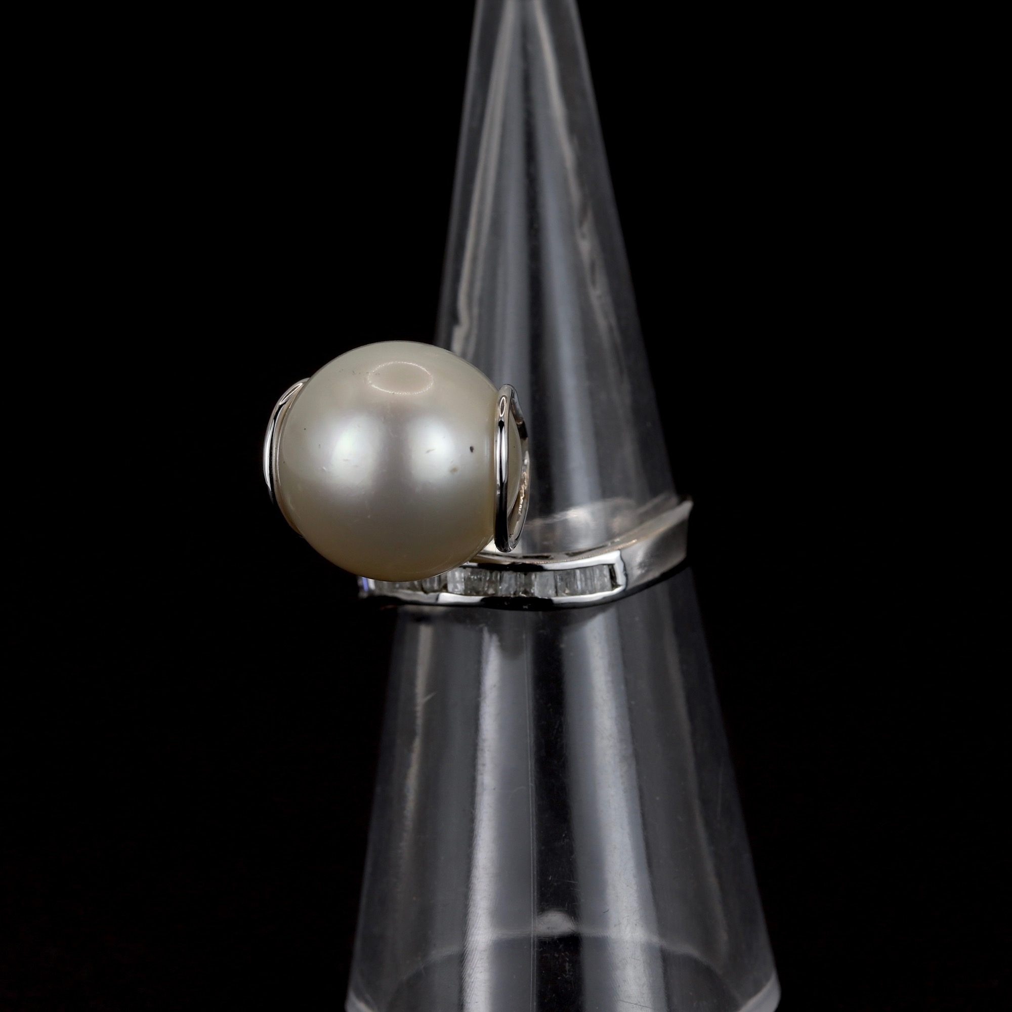A 14K white gold dress ring set with large cultured pearl and row of channel set diamonds.