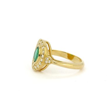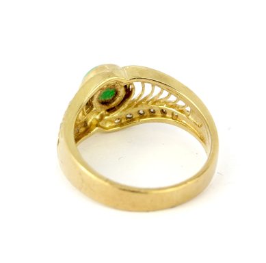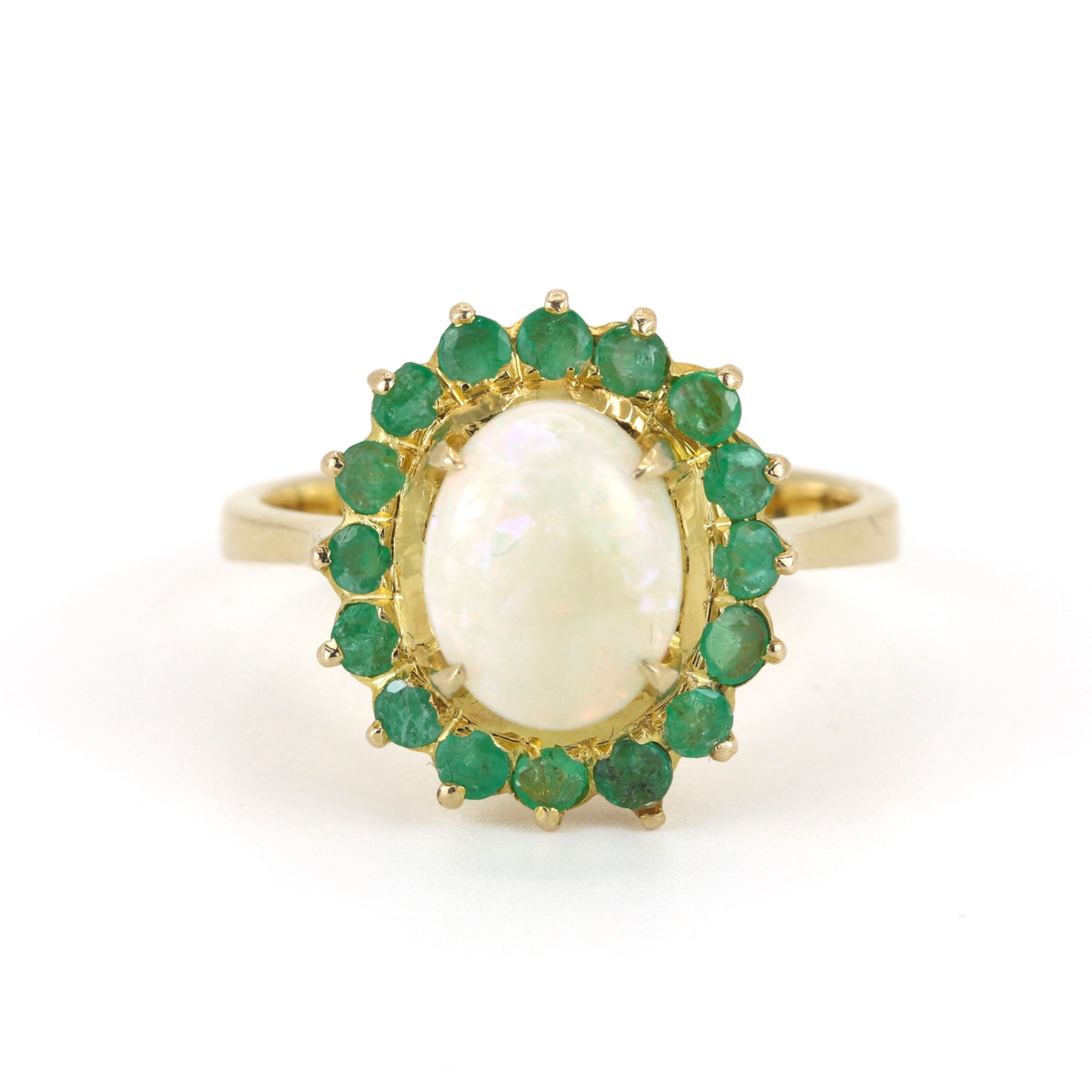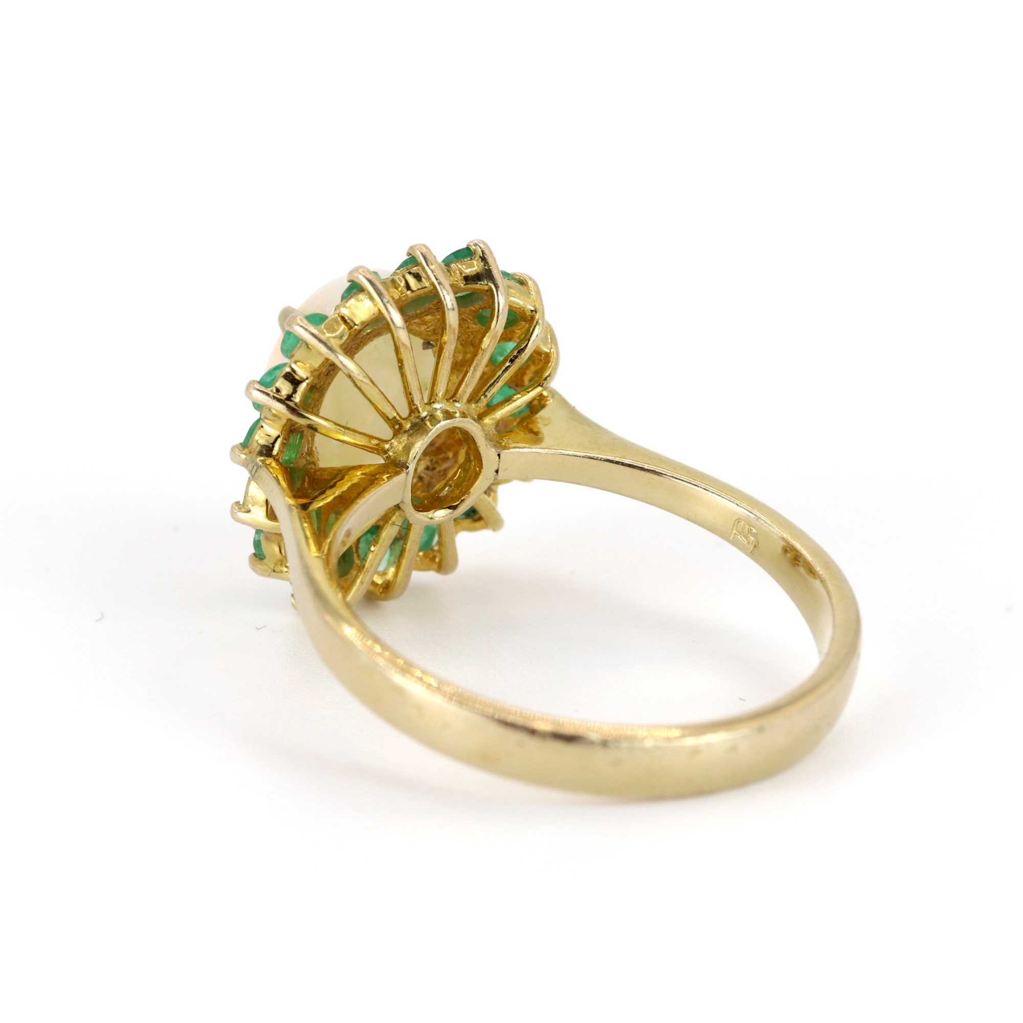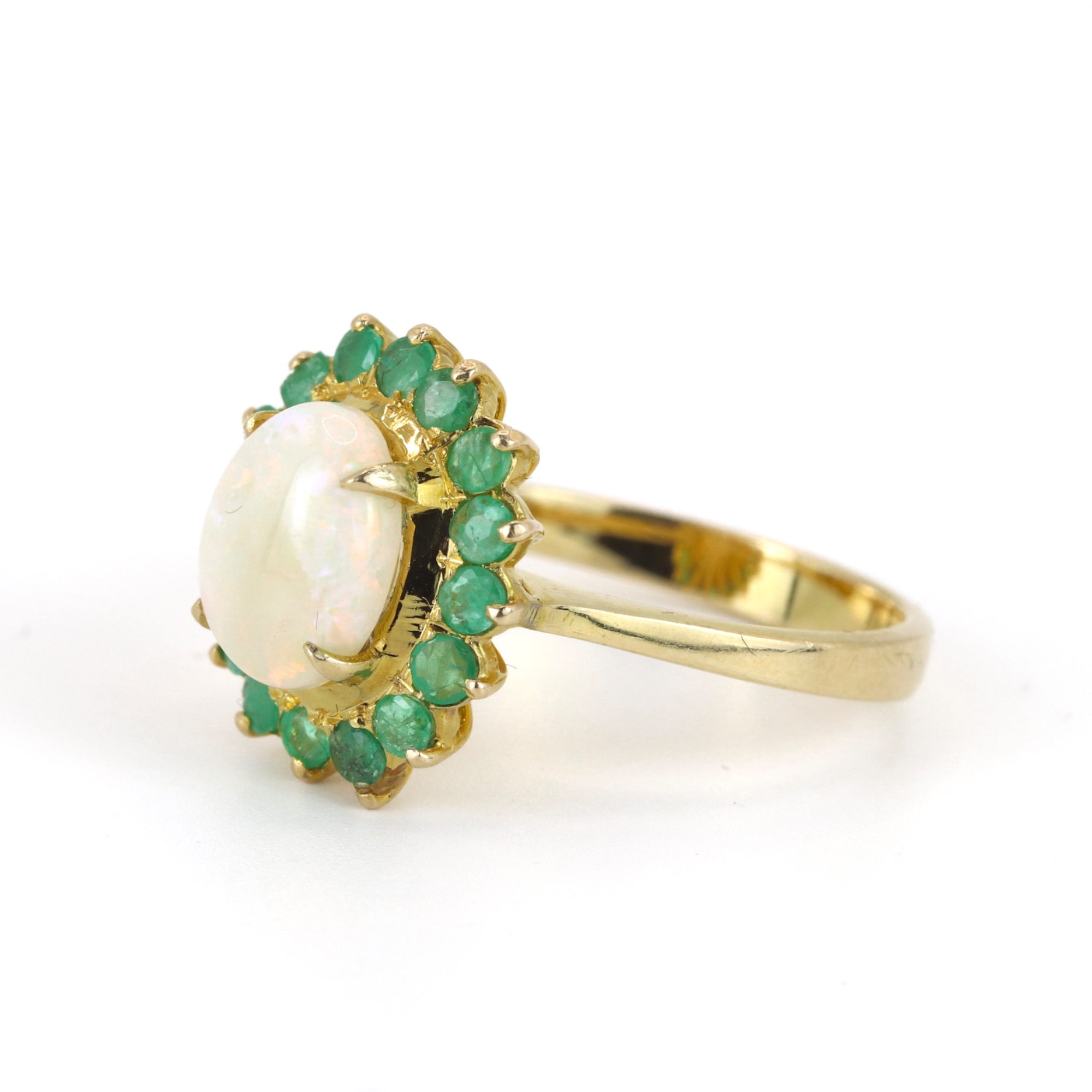 A 14K yellow gold ring set with large cabochon opal surrounded by eighteen small round cut emeralds.