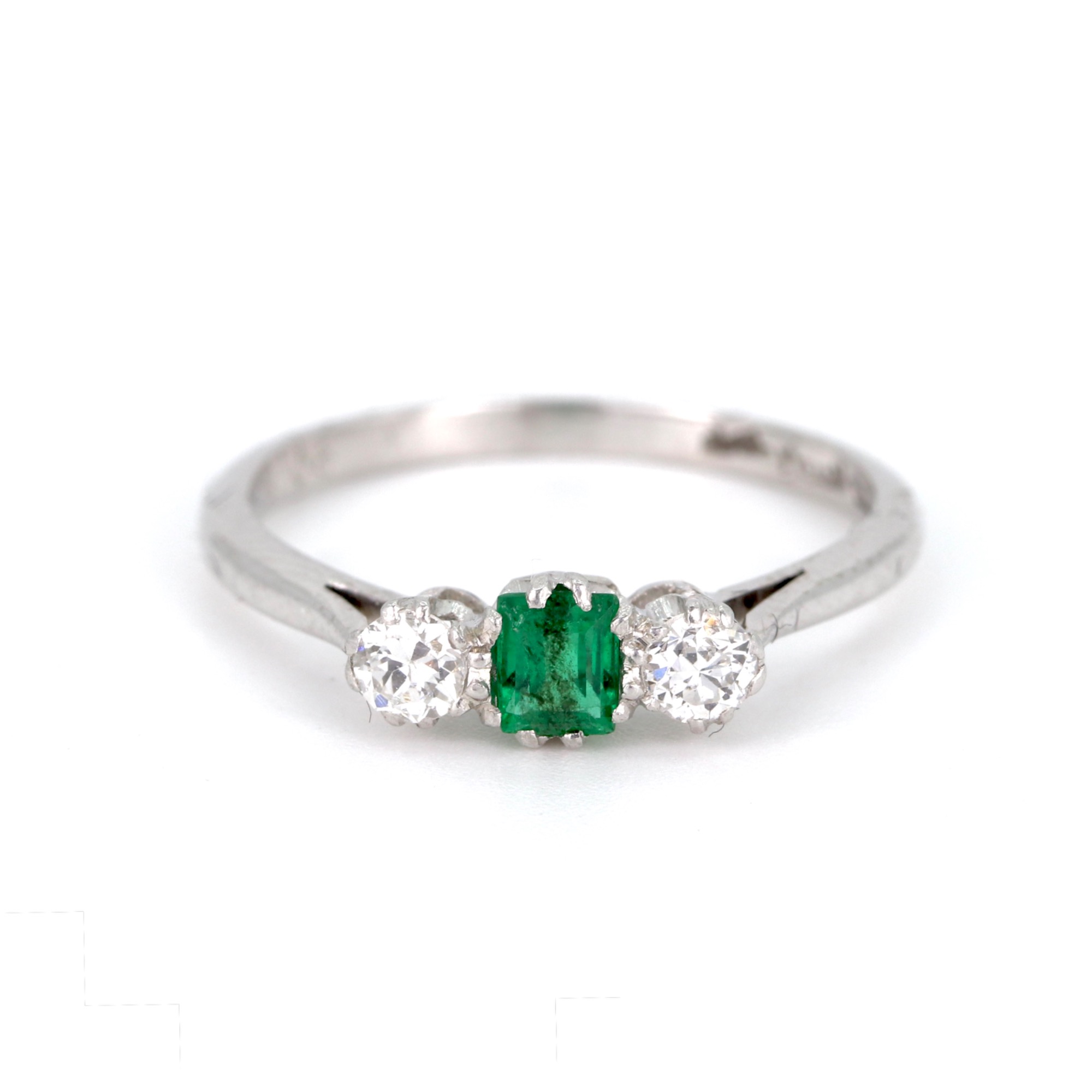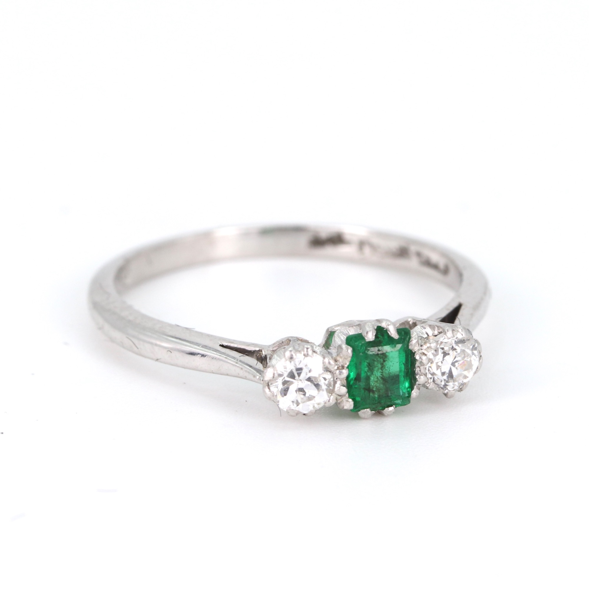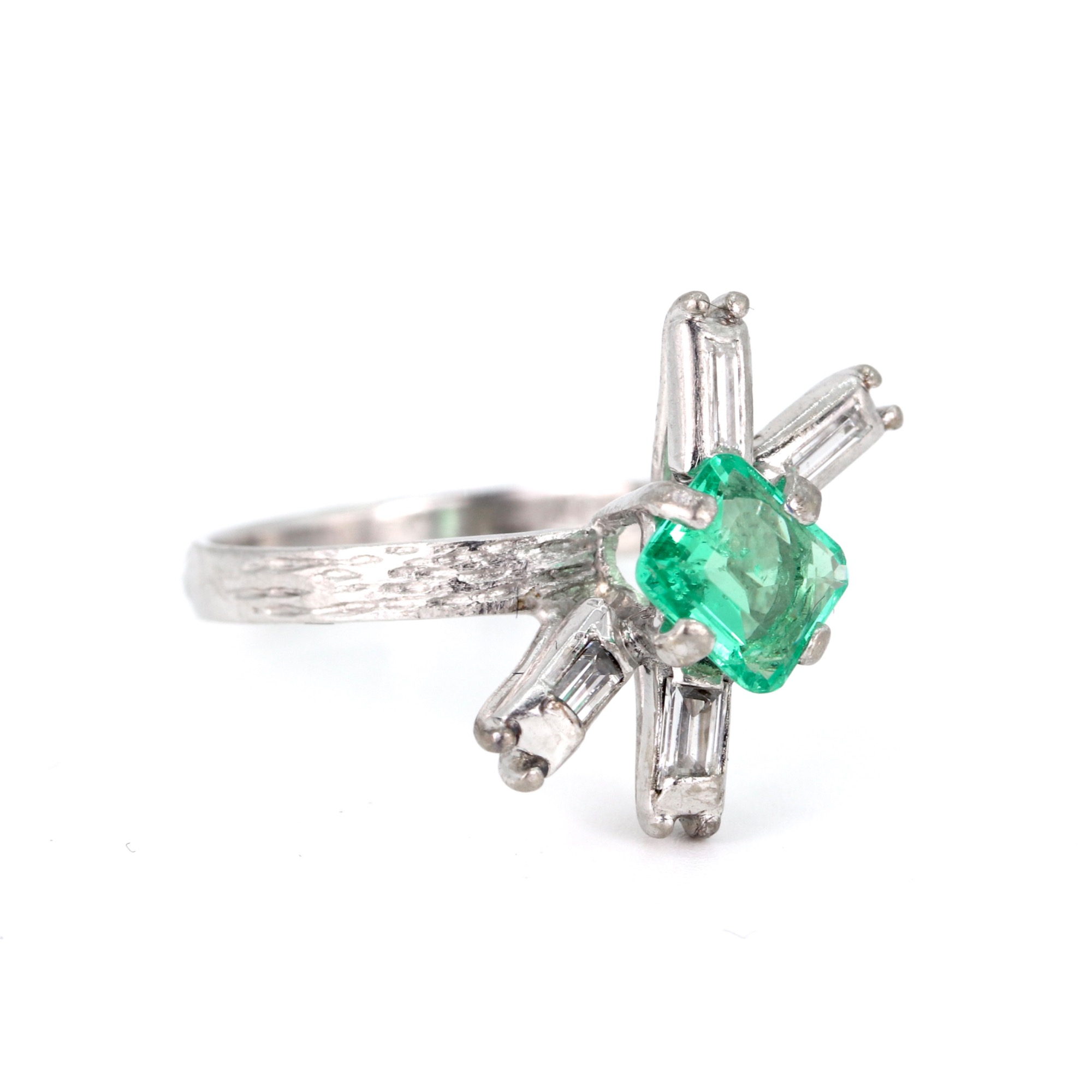 A platinum ring set with cushion cut emerald and baguette cut diamonds. UK ring size: L