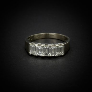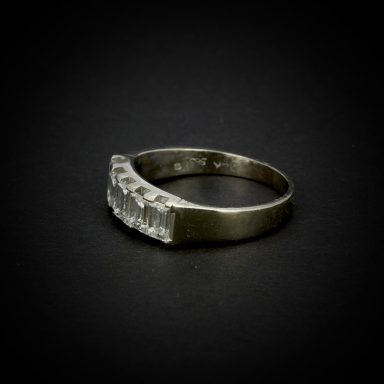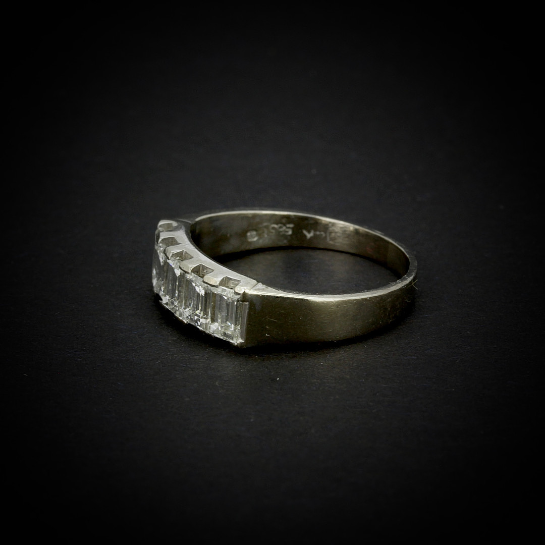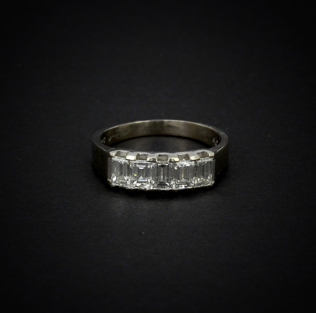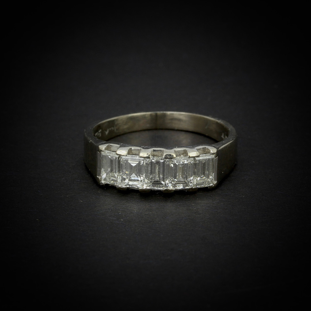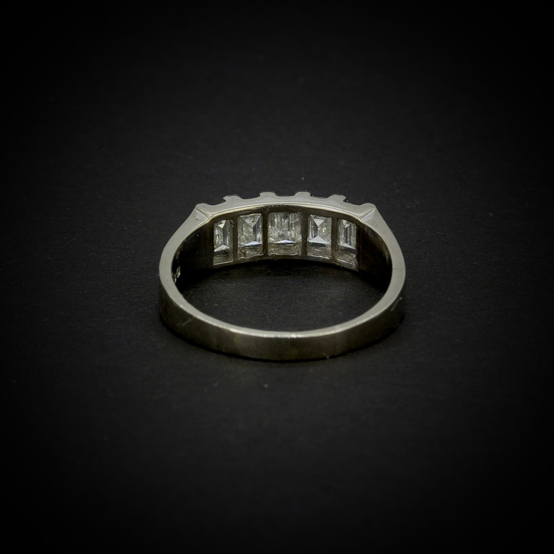 14ct white gold 1950's five stone diamond ring. The ring set with baguette cut diamonds total apporx 1.5ct, color G-H, SSV2-Si. Ring size Q, weight 4.7g.