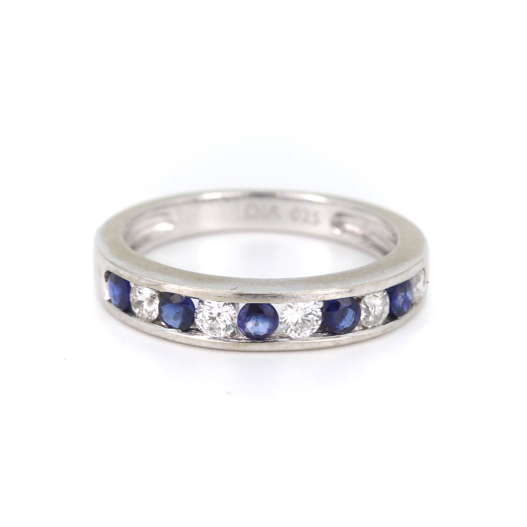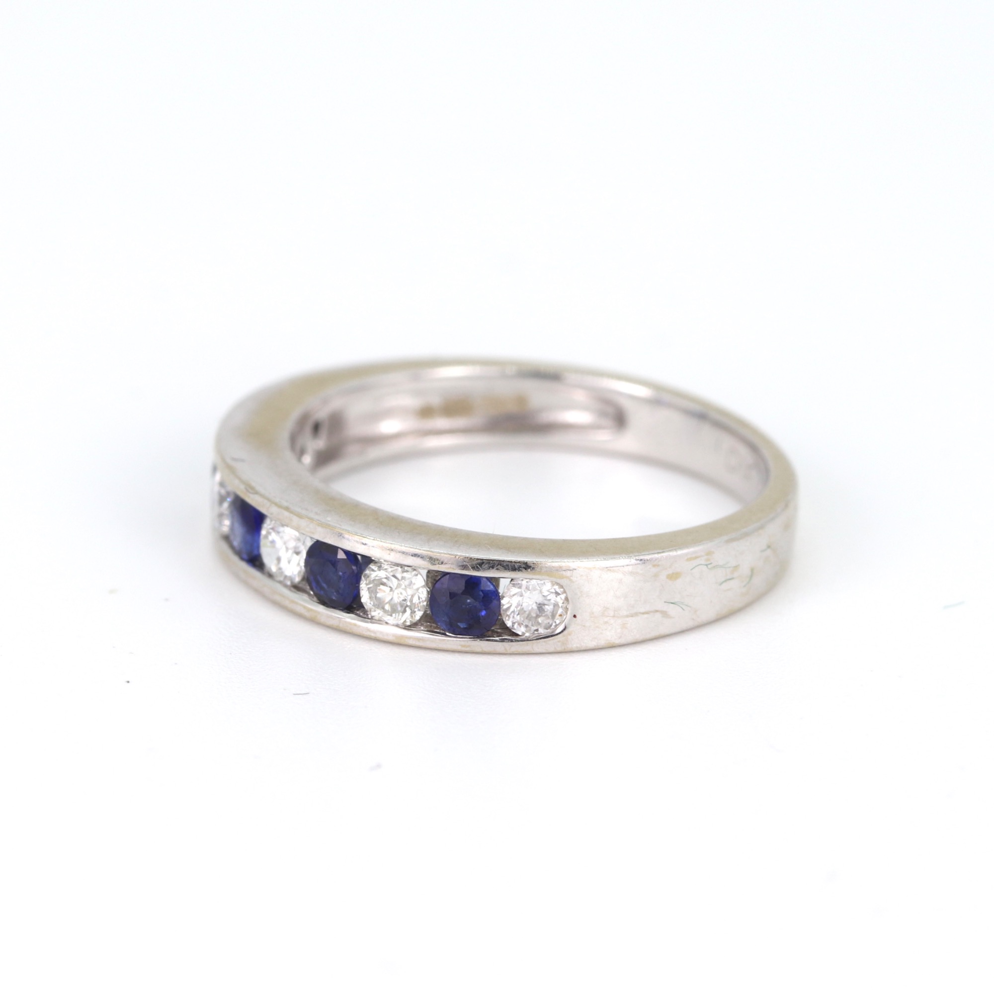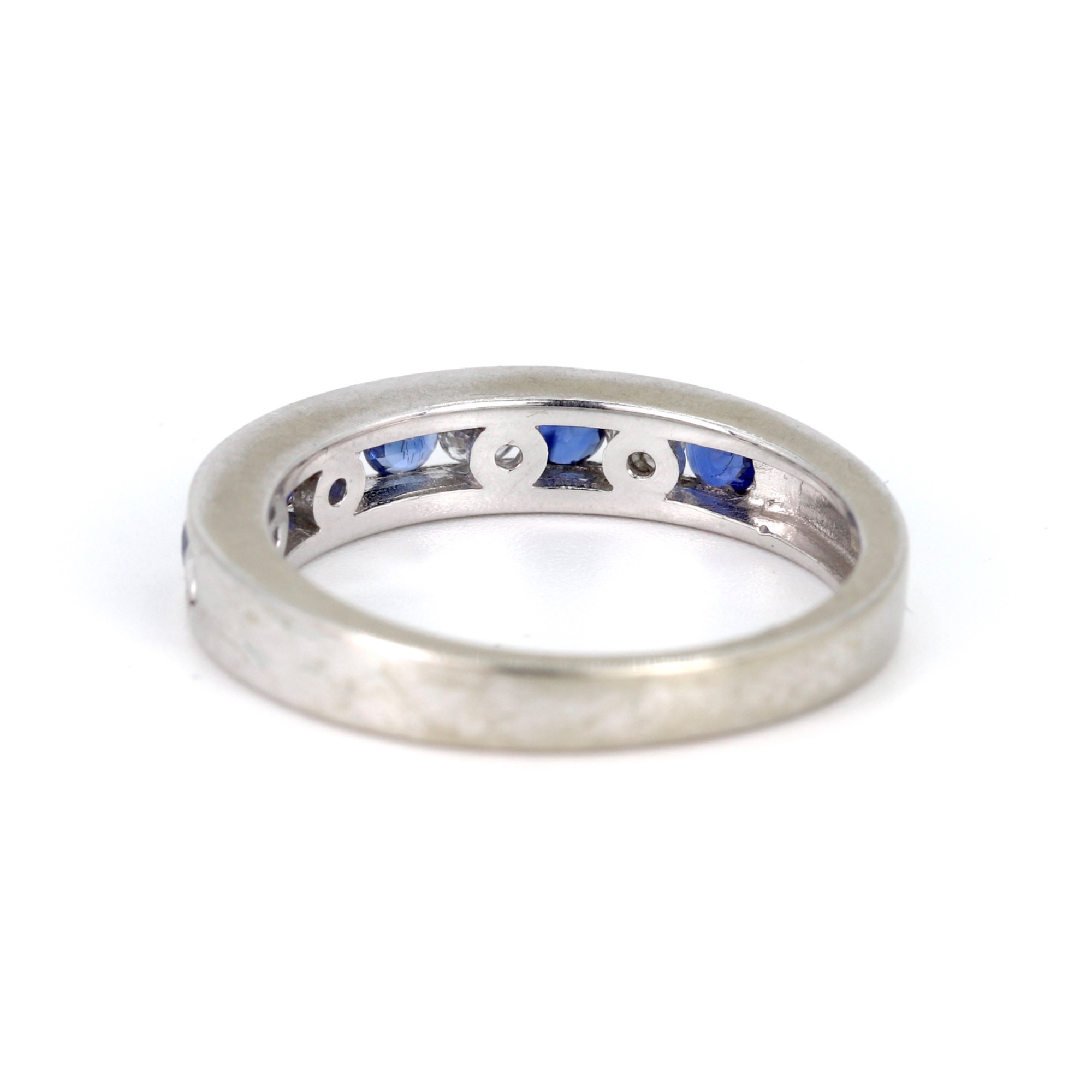 An 18K white gold half eternity ring set with sapphires & diamonds. Dia. 0,25ct total. UK ring size: J.