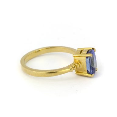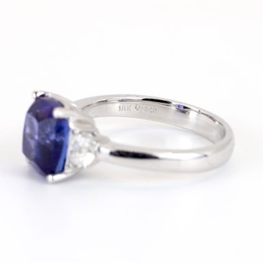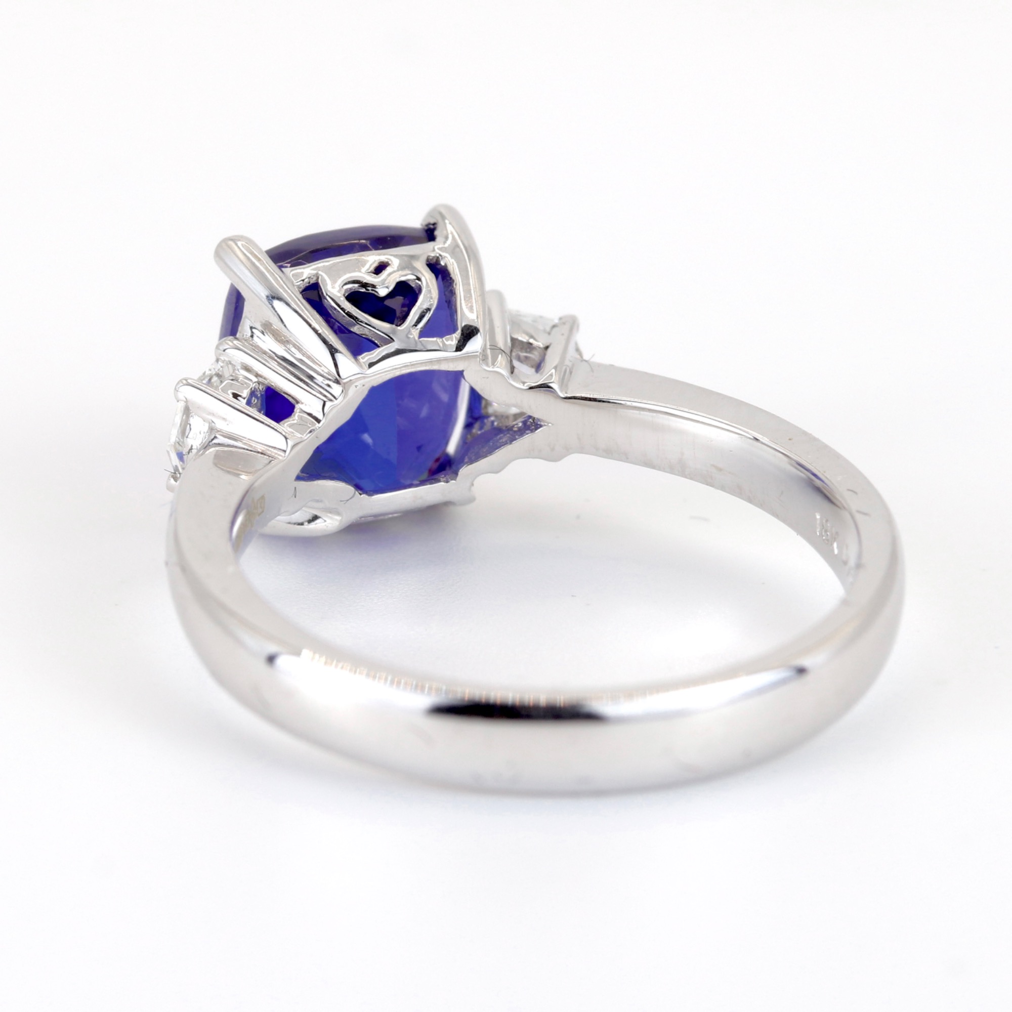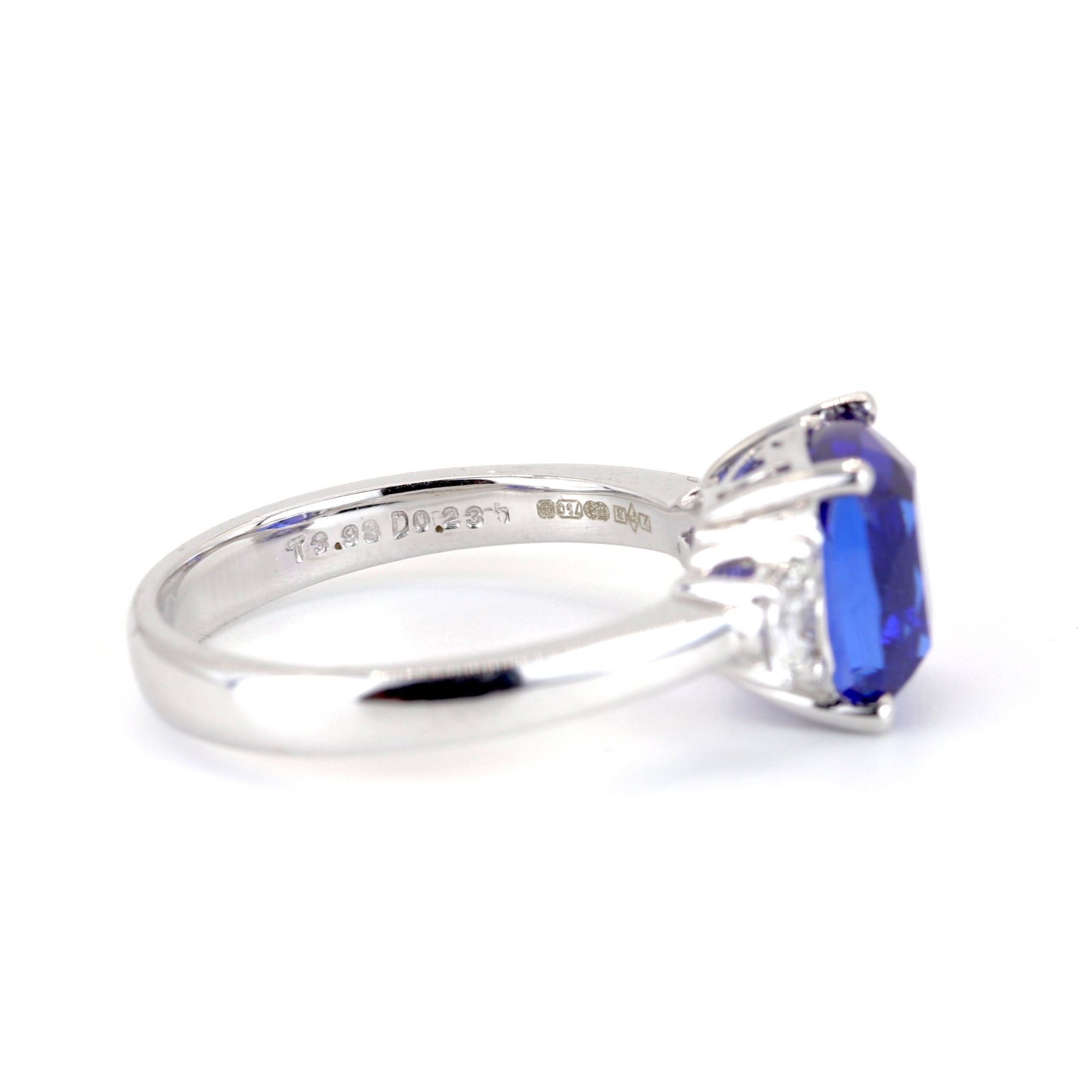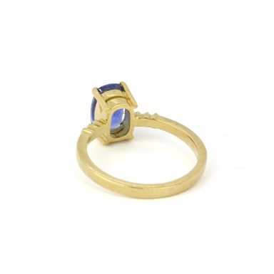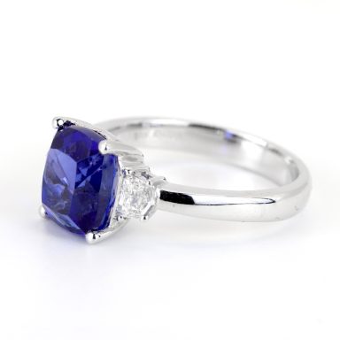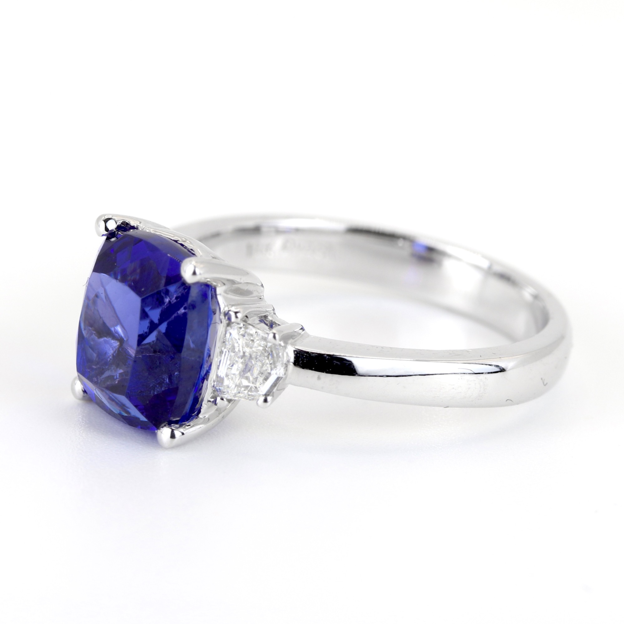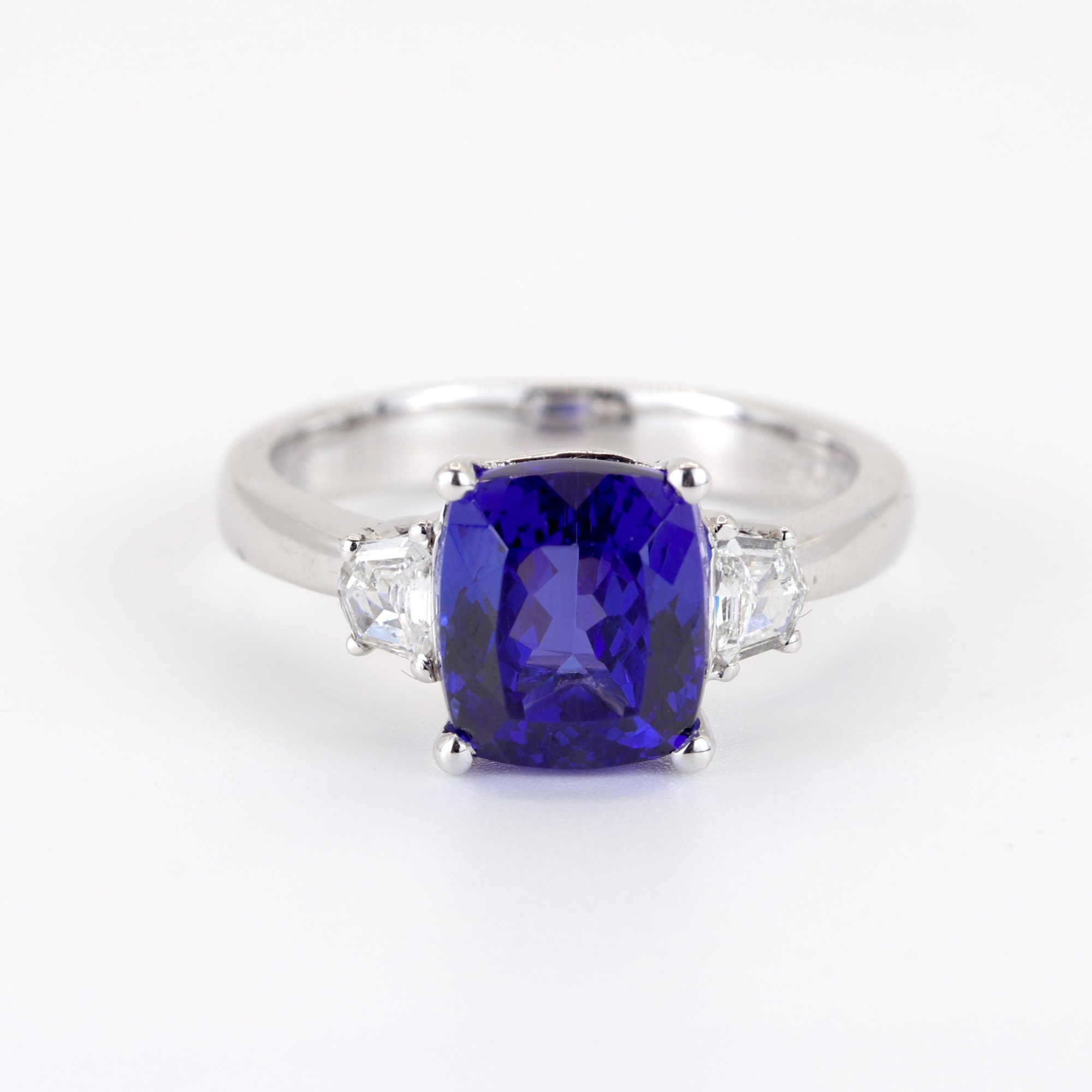 A 18K white gold ring set with cushion cut tanzanite and two fancy cut diamonds on the sides.