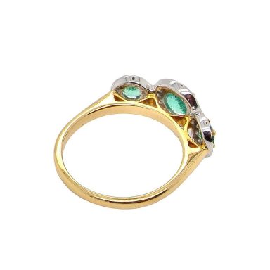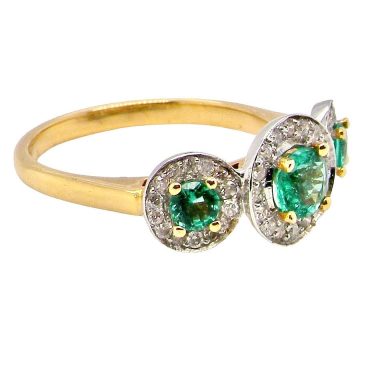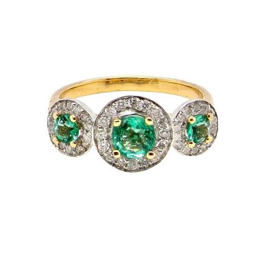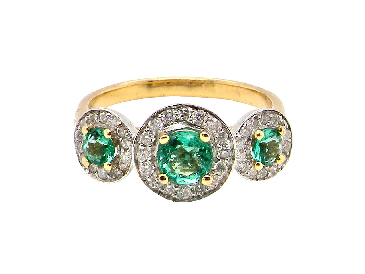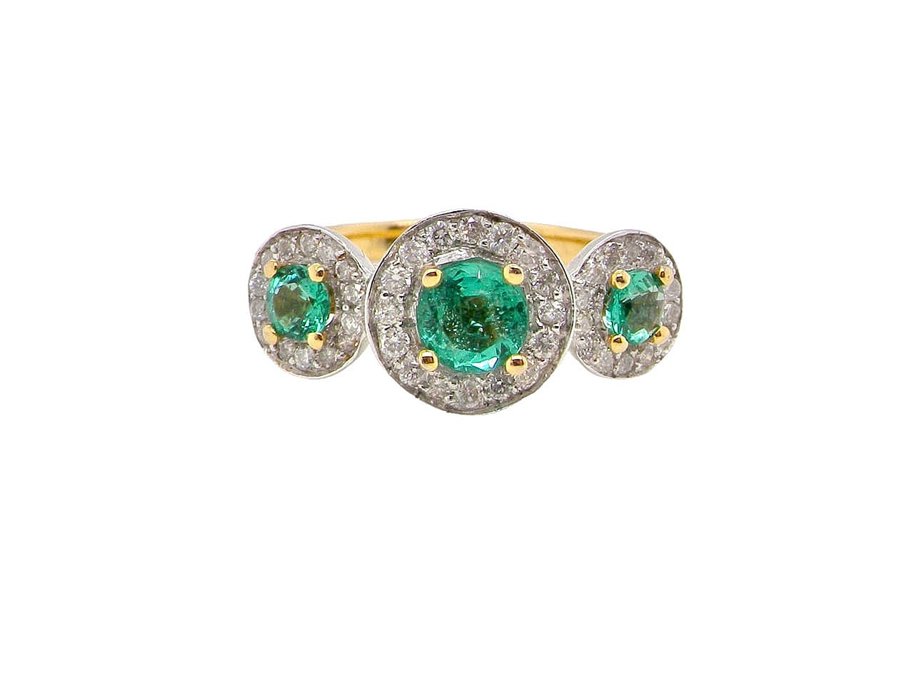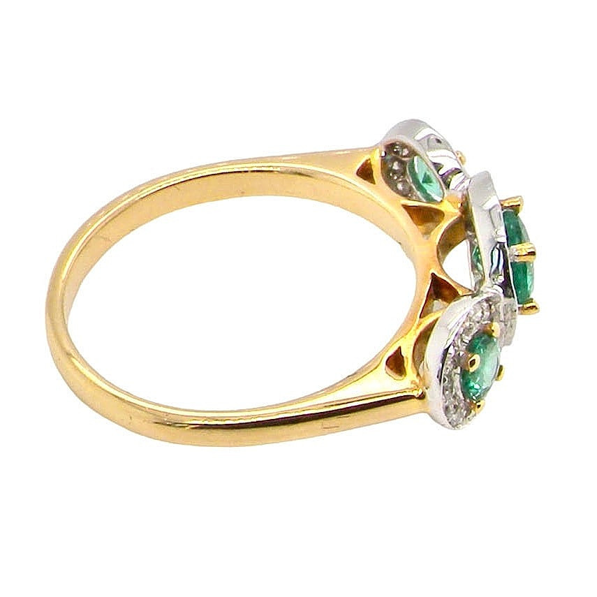 An 18ct yellow gold and platinum three-cluster ring set with emeralds surounded by diamonds (approx. 0,5ct).