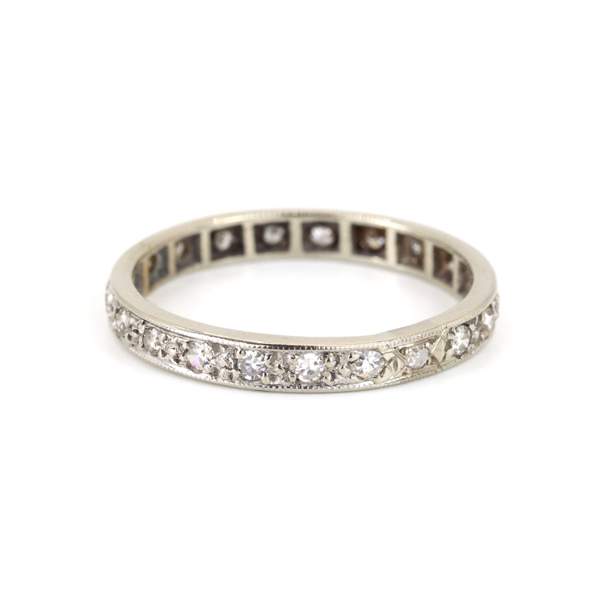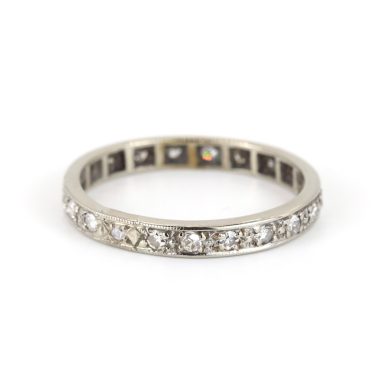 Victorian 18ct Gold dress ring set with seventeen old cut diamonds estimated total 0.4-0.5ct. Shoulders ate engraved in a foliate design, hallmarked Birmingham 1899, UK size N,5., weight 3.7g.