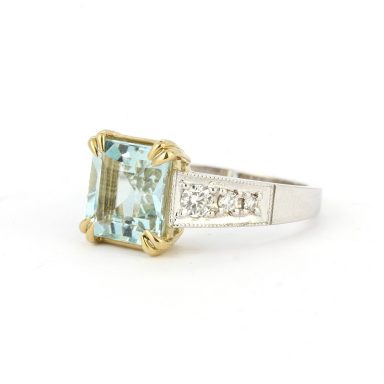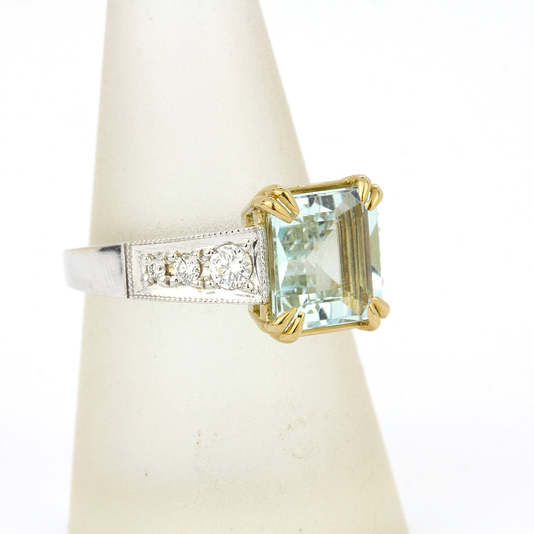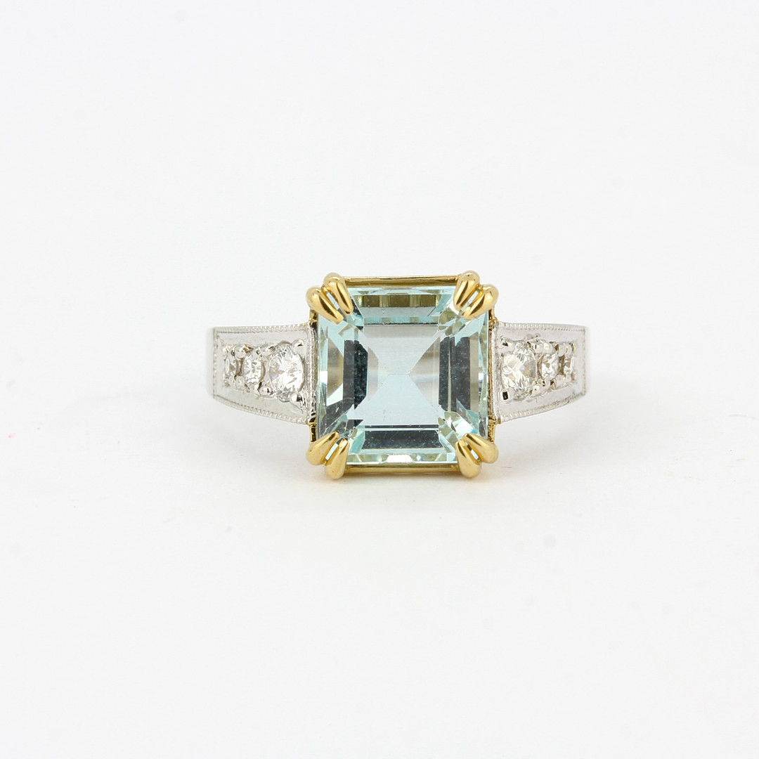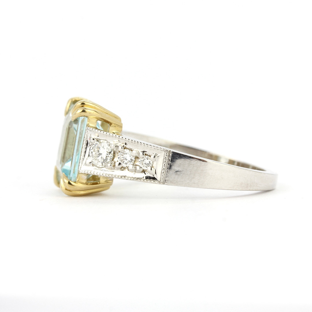 An 18ct white gold ring set with large princes cut aquamarine set in yellow gold setting and diamonds on the shoulders. UK ring size: Q. Total weight: 6,5g.