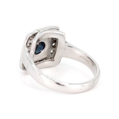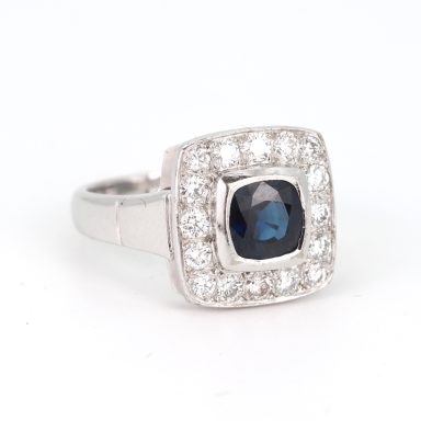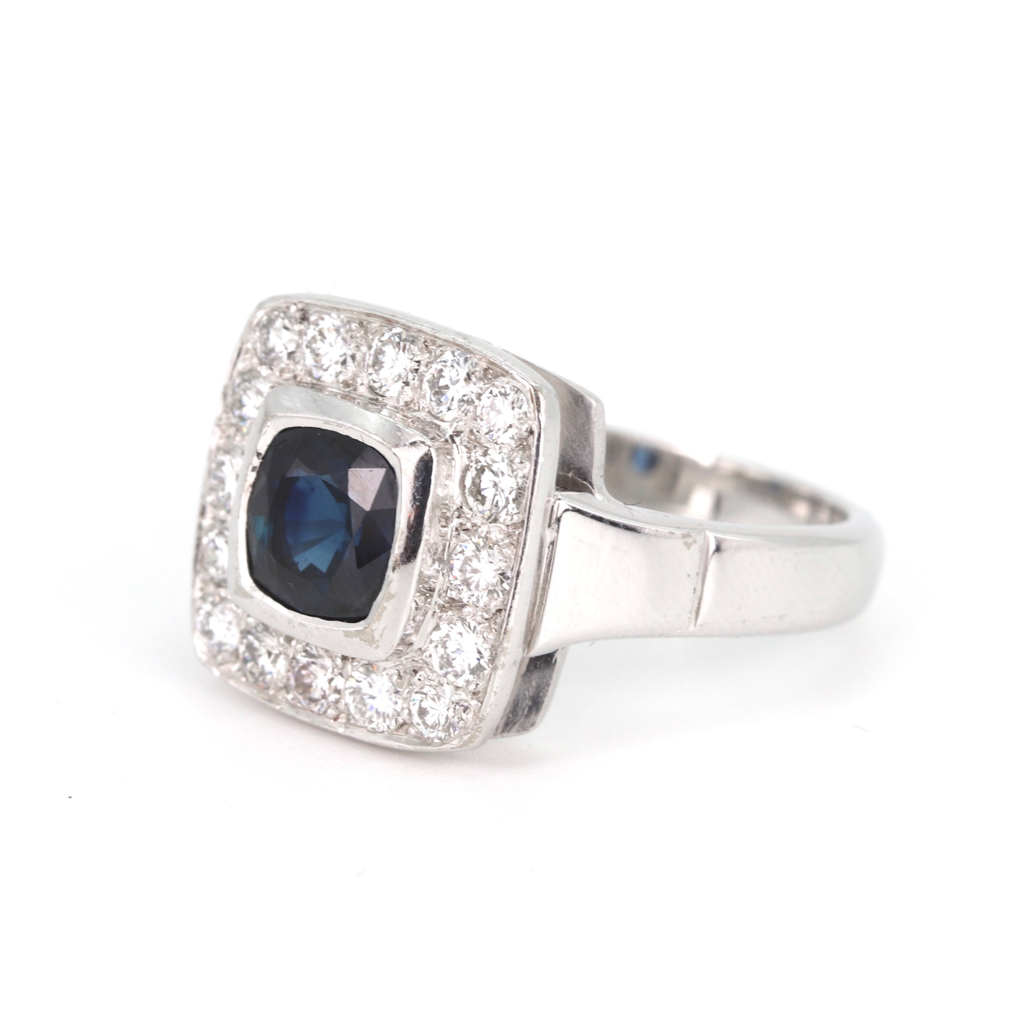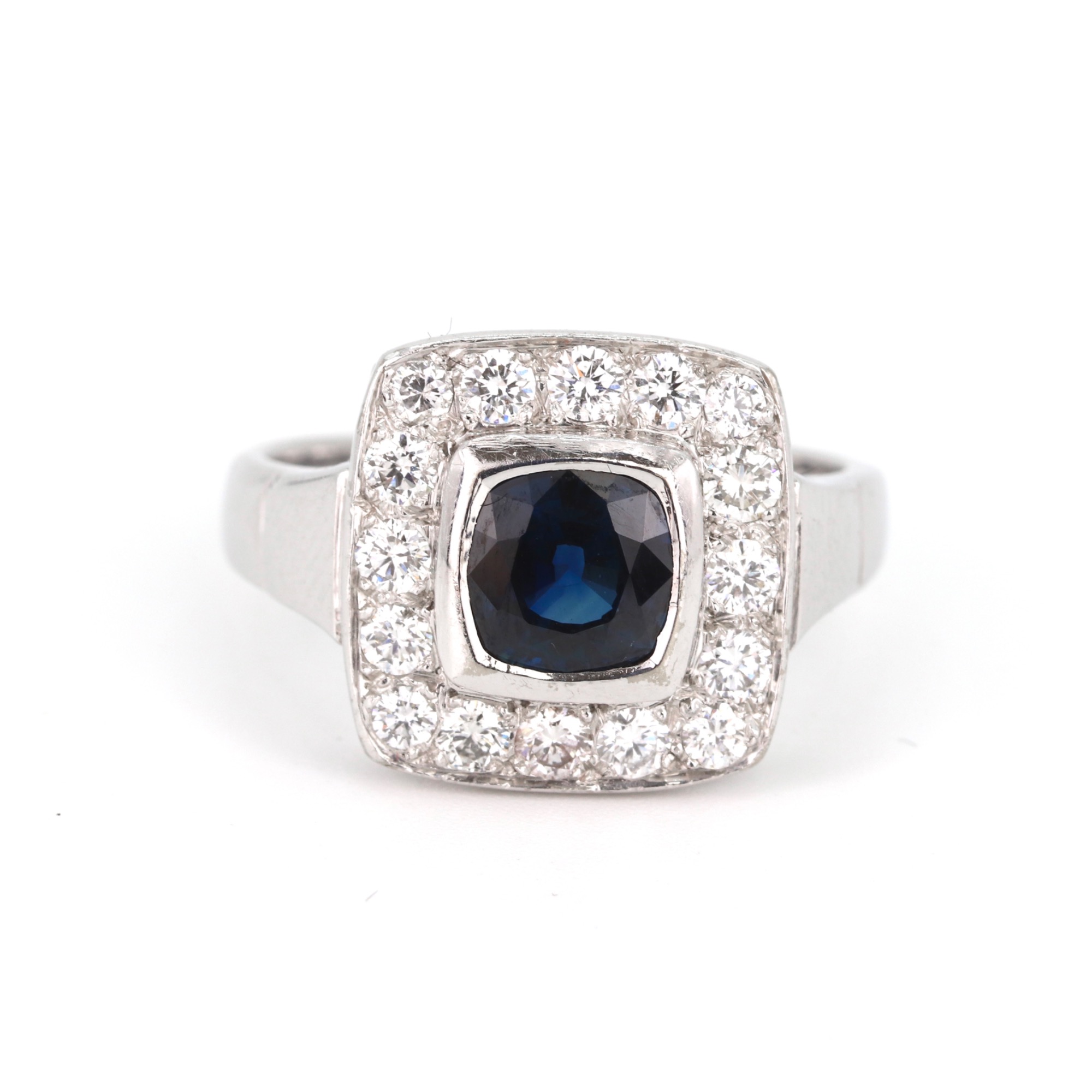 An 18K white gold ring set with cushion cut sapphire surrounded by round brilliant cut diamonds. Dia total. 0,60ct approx.