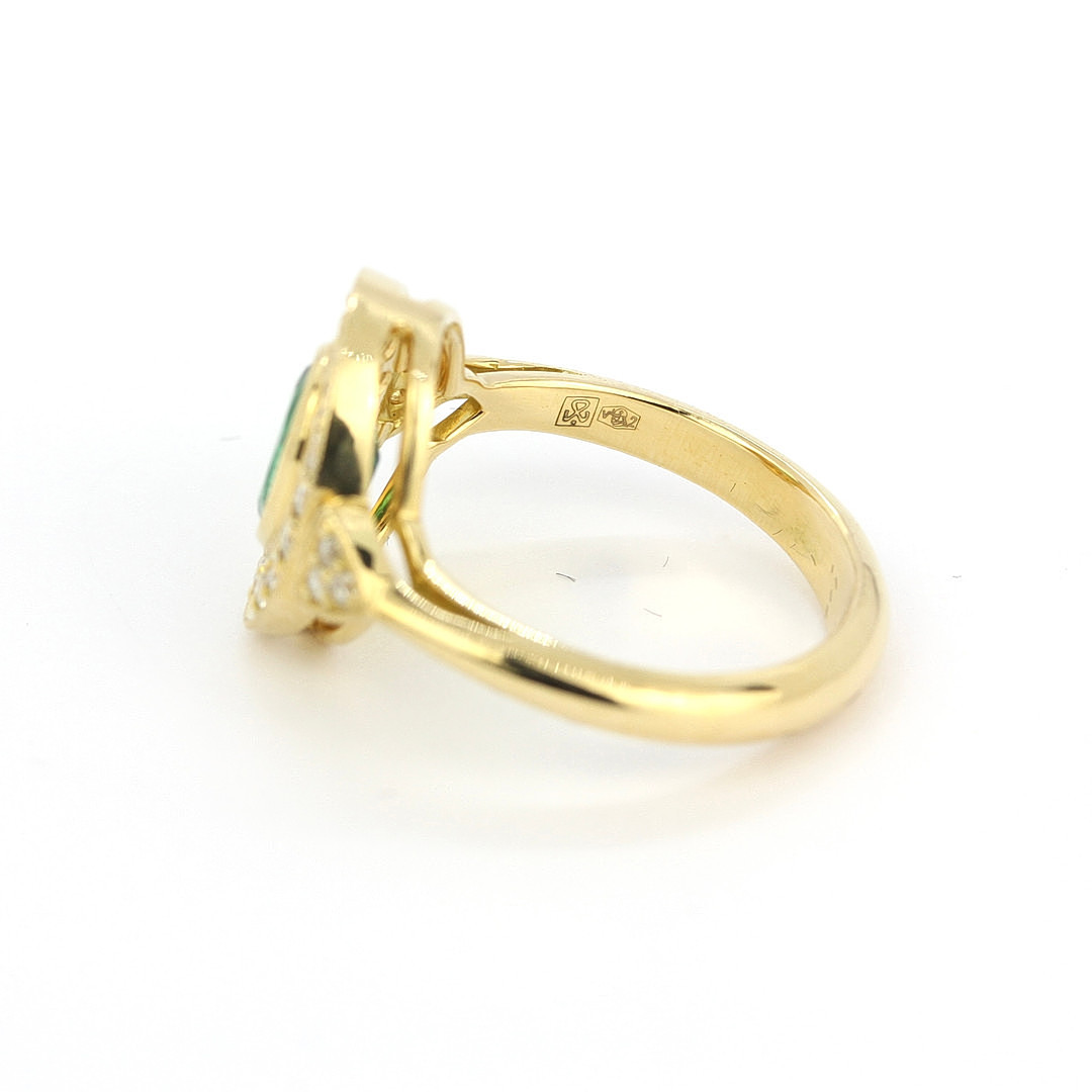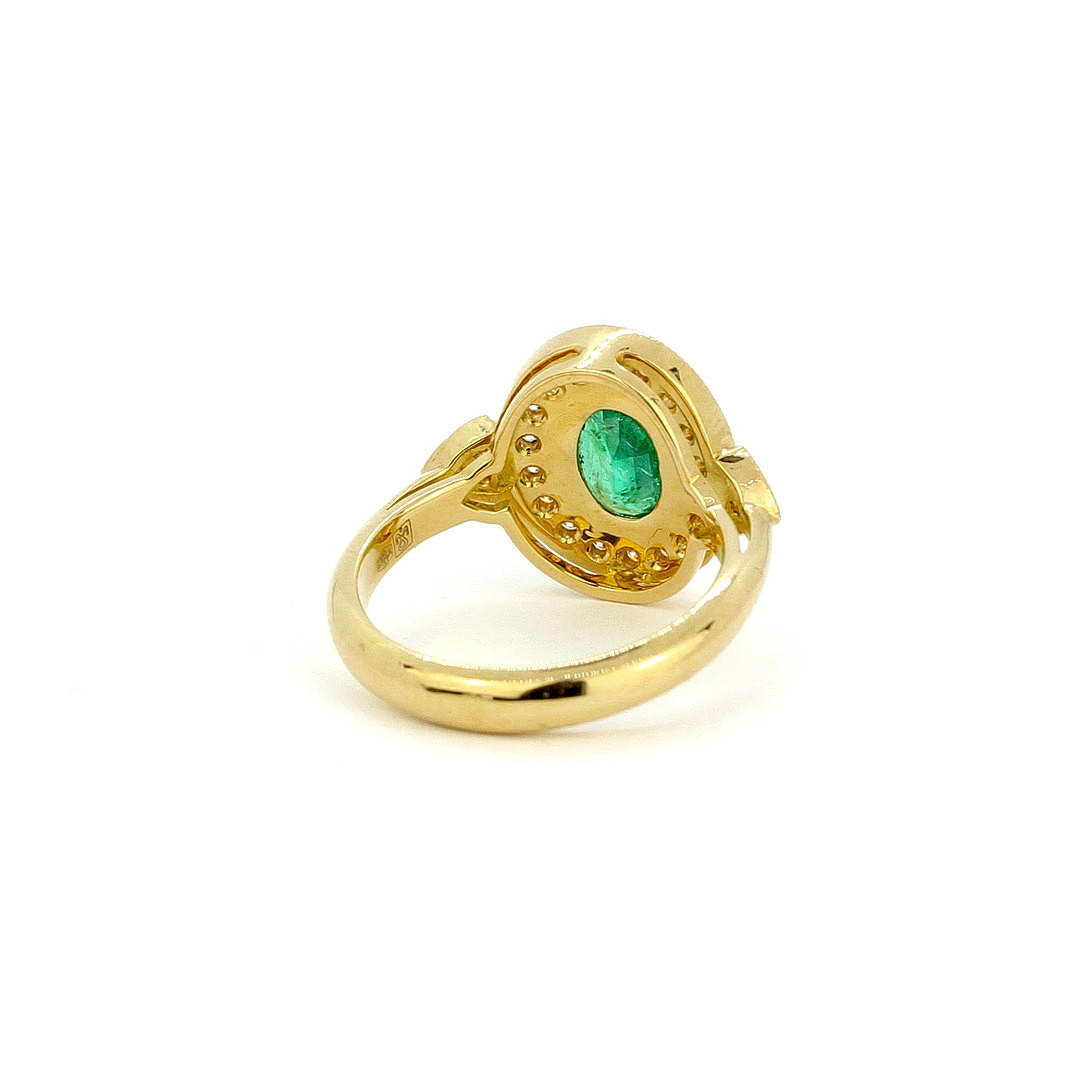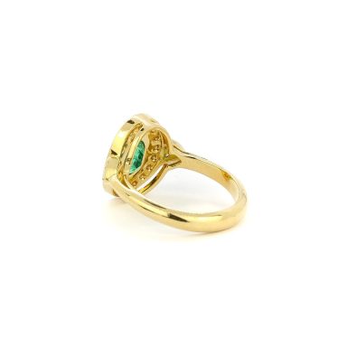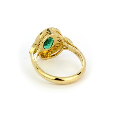 An 18ct yellow gold ring set with large emerald (1,29ct IGI certified) surrounded by eighteen diamonds with additional six on the shoulders. (approx. 0.35ct total, H, VVS1/VVS2). Ring total weight: 8.16g Uk ring size: O,5. Emerald IGI certificate included. Continental Hallmarks. Brand new custom made ring/ Newer used.