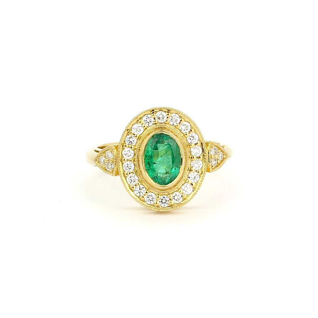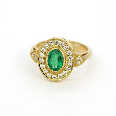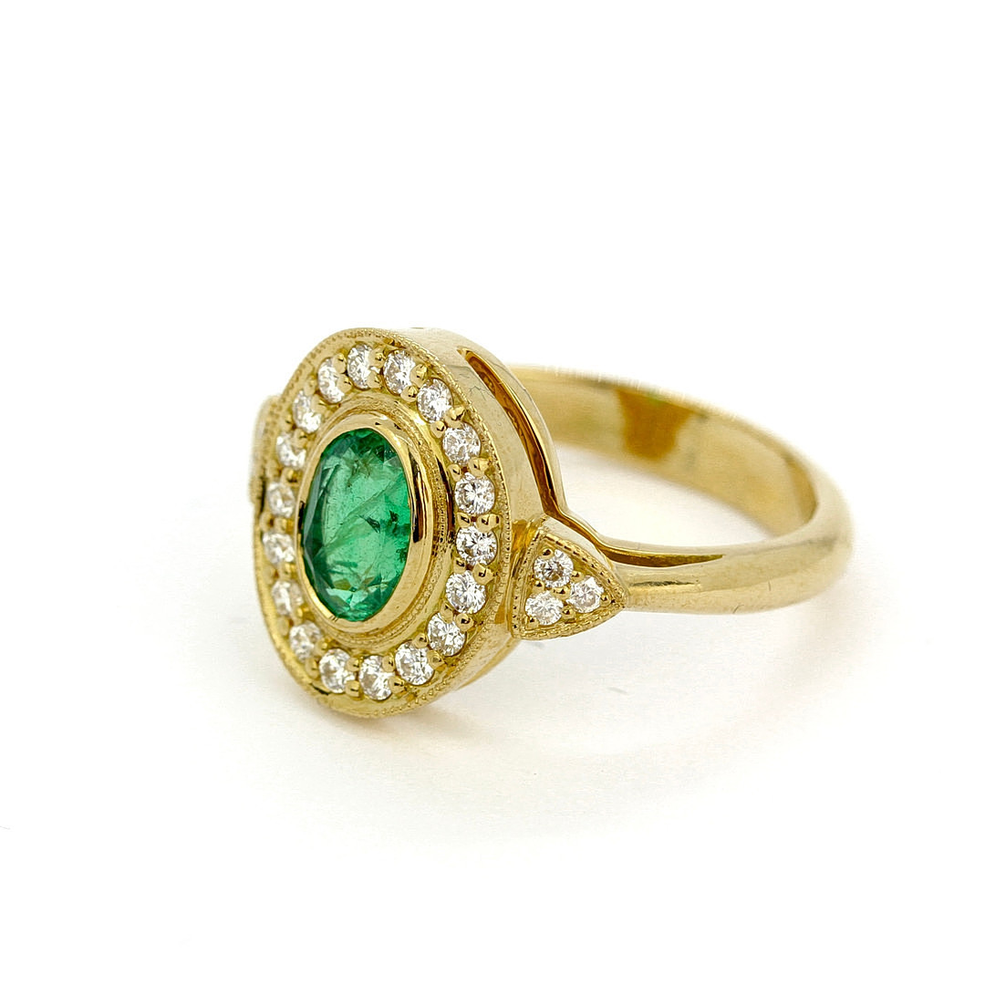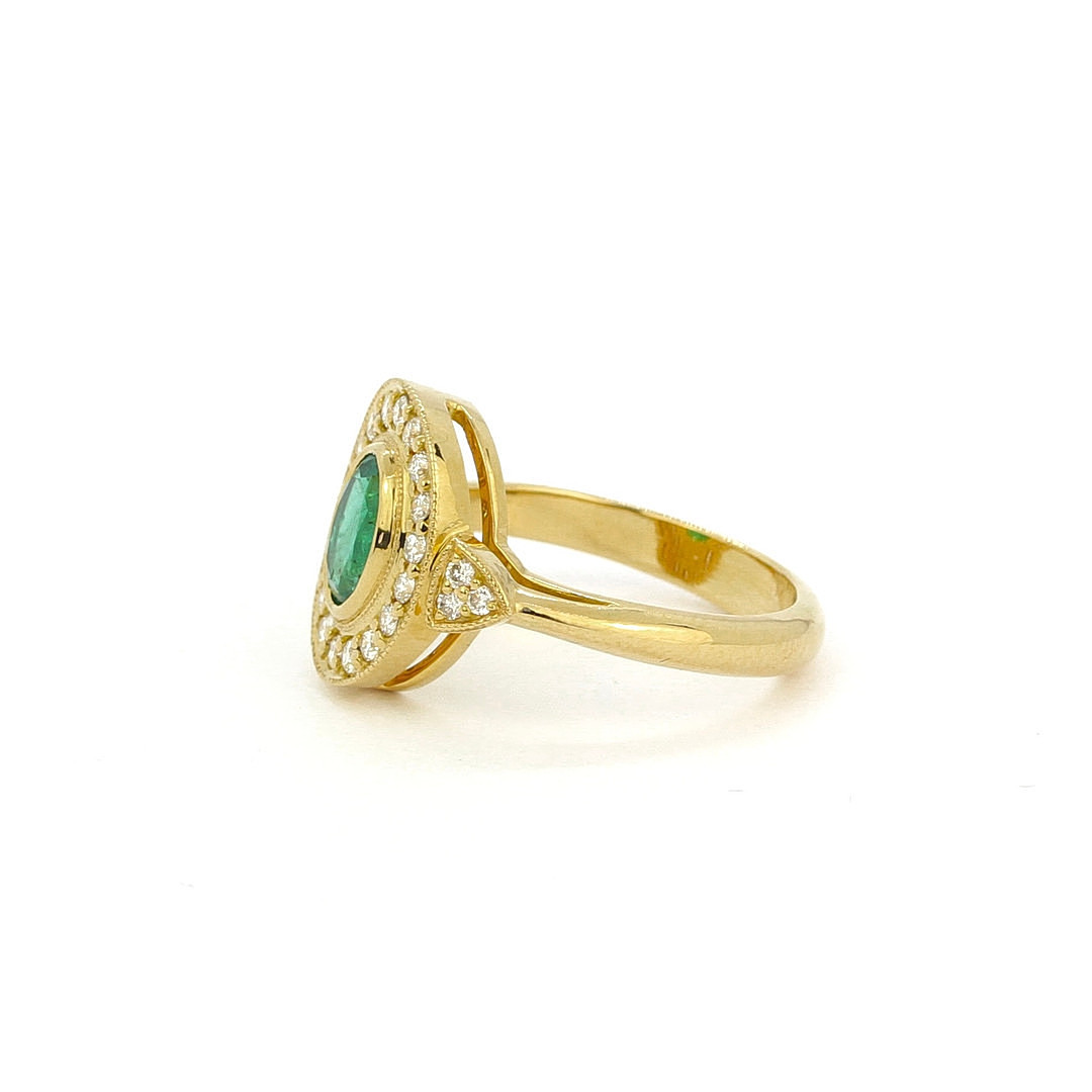 An 18ct yellow gold ring set with large emerald (1,29ct IGI certified) surrounded by eighteen diamonds with additional six on the shoulders. (approx. 0.35ct total, H, VVS1/VVS2). Ring total weight: 8.16g Uk ring size: O,5. Emerald IGI certificate included. Continental Hallmarks. Brand new custom made ring/ Newer used.