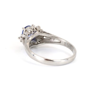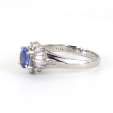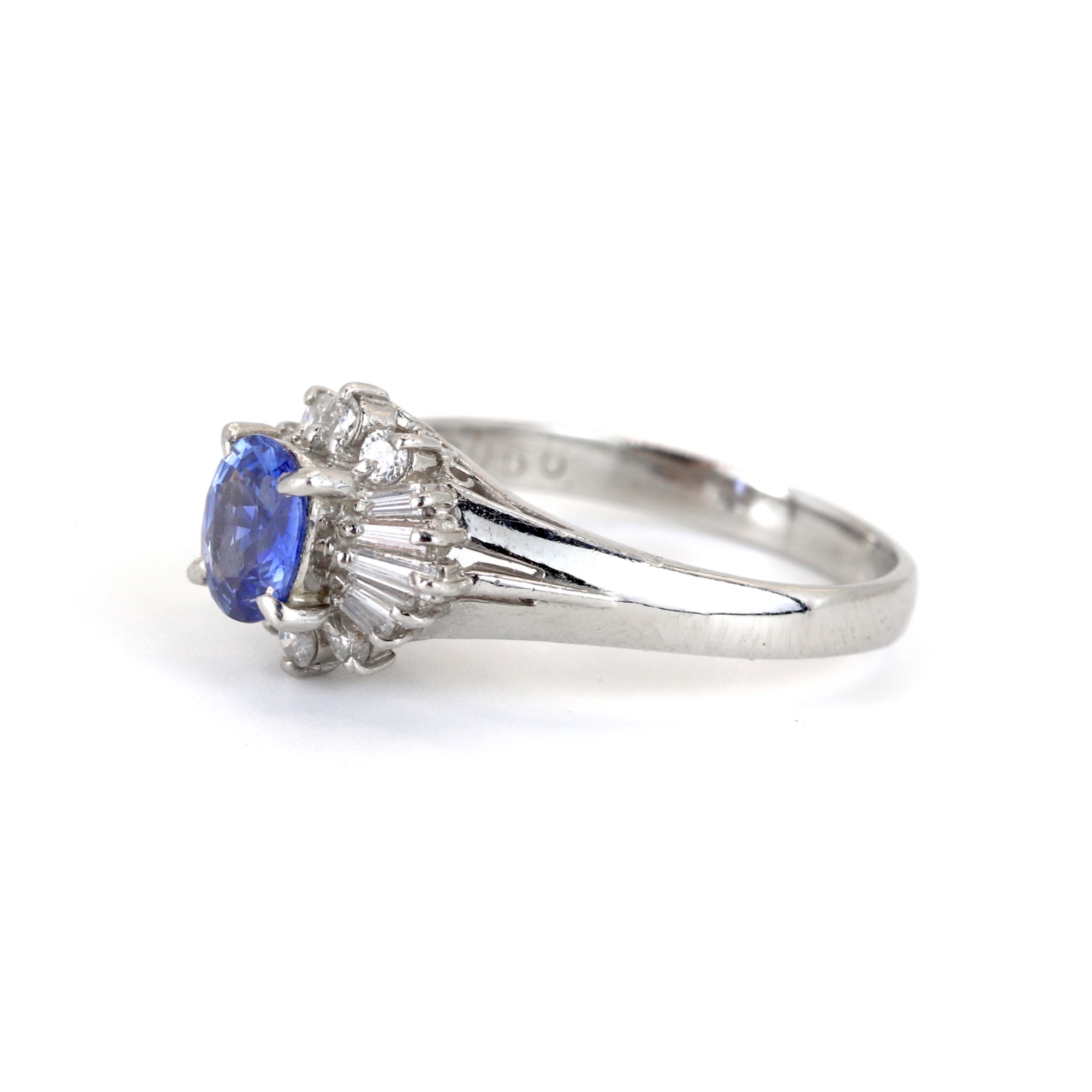 An Art eco Platinum cluster ring set with oval cut cornflower blue sapphire ( 0,31ct approx.) surrounded by baguette cut diamonds.