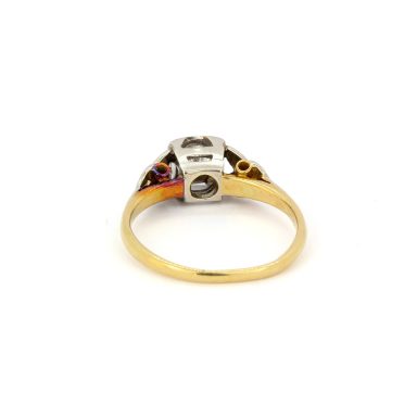 18ct yellow gold antique ruby and diamond ring. Two old cut diamonds approx 0.25ct each and three rubies approx 0.8ct. Size L, weight 7.2g.
