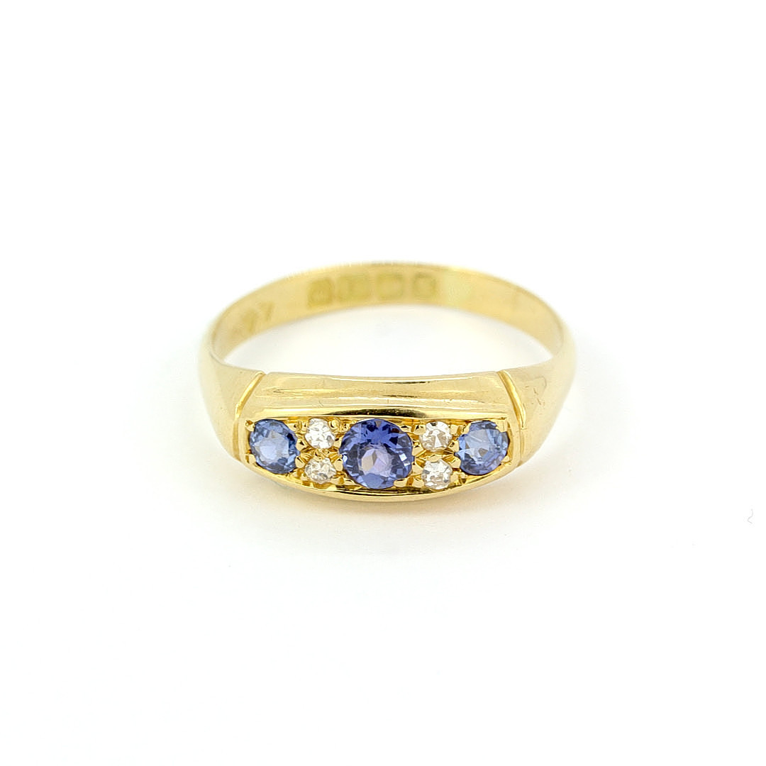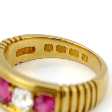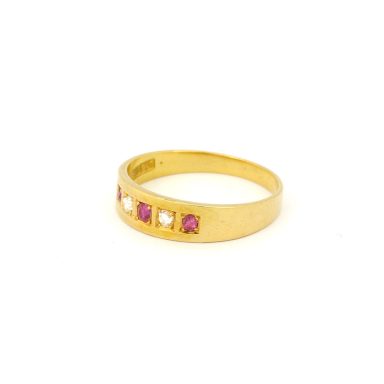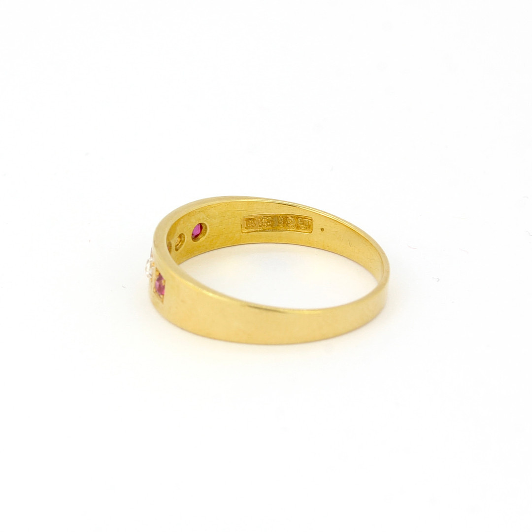 Antique 18ct yellow gold band ring set with three rubies and two diamonds. Size N, weight 2.7g.