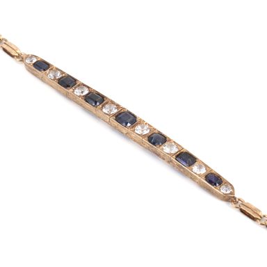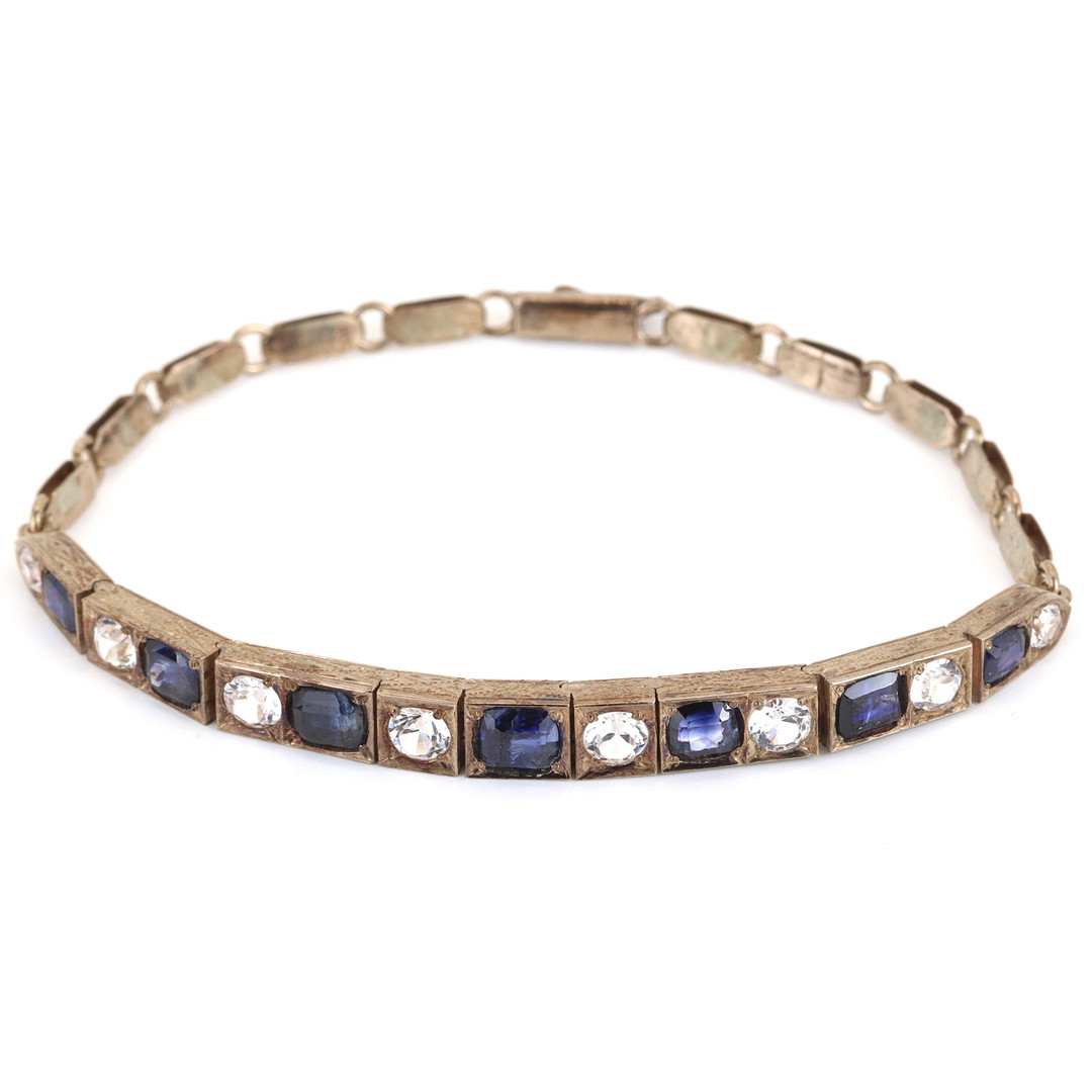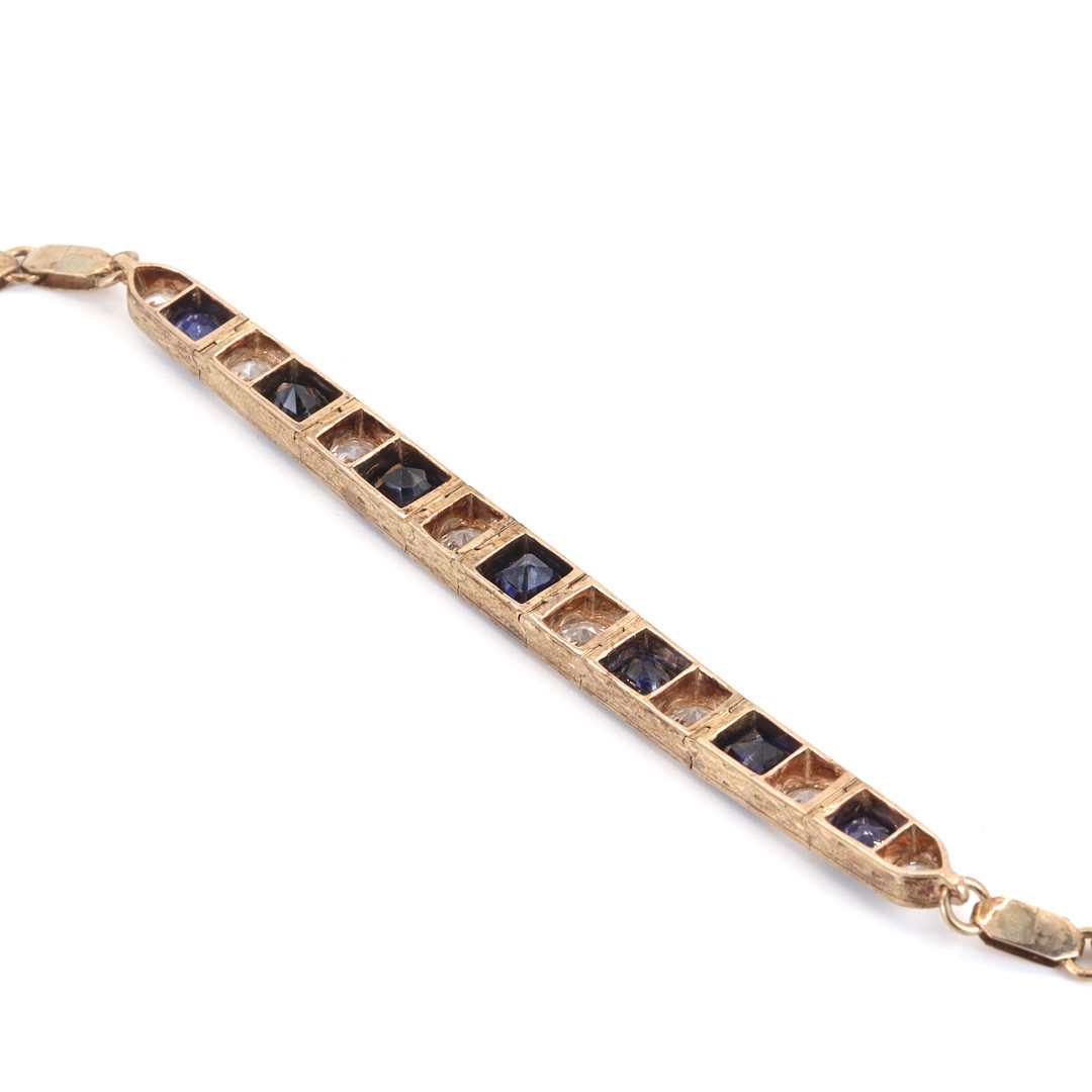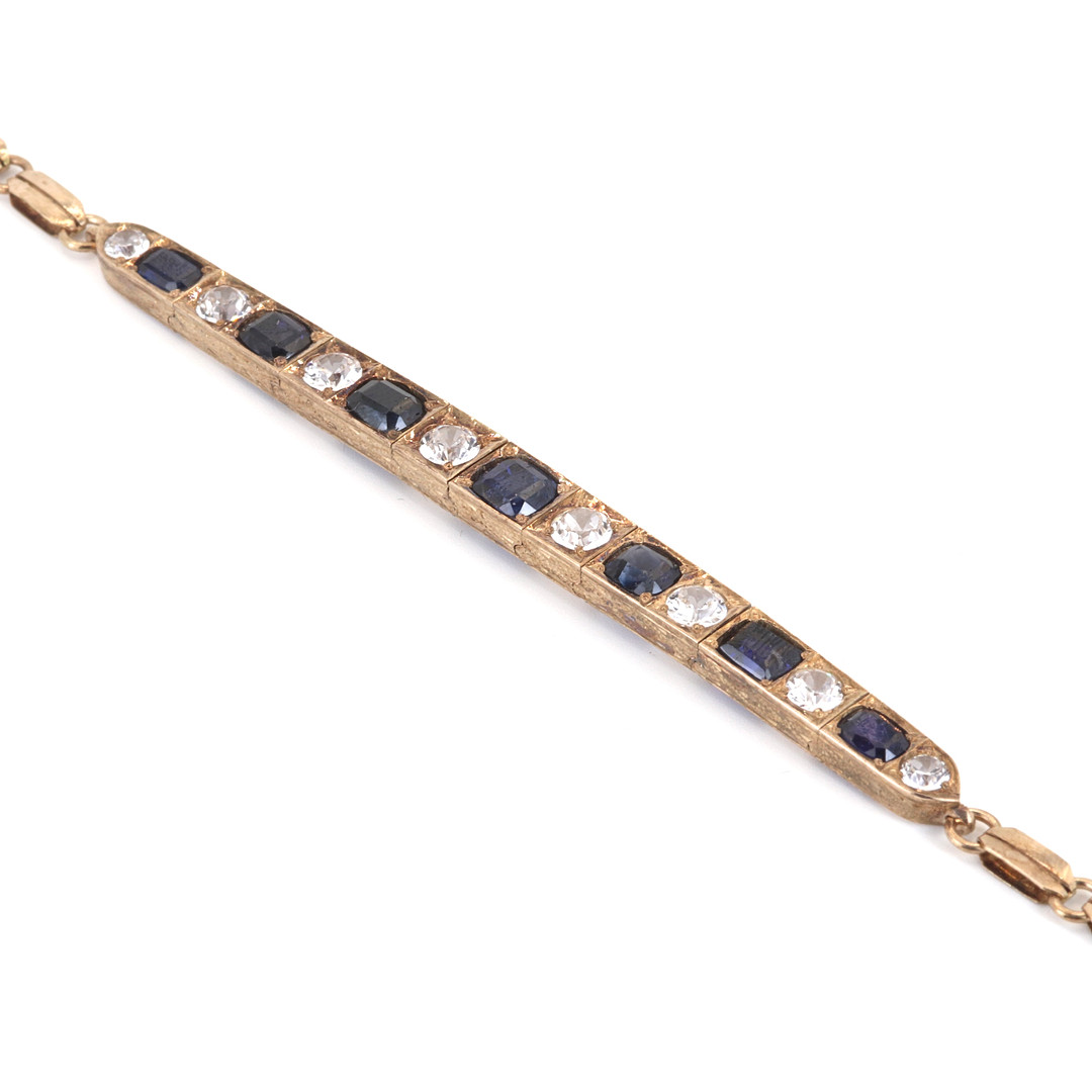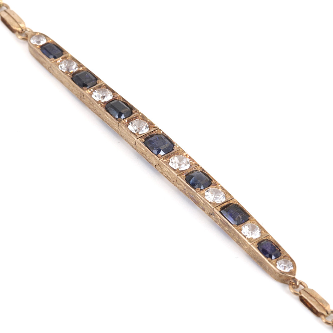 9K rose gold bracelet set with round cut white sapphires and cushion cut blue sapphires.
