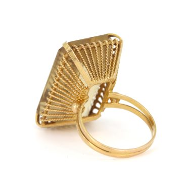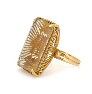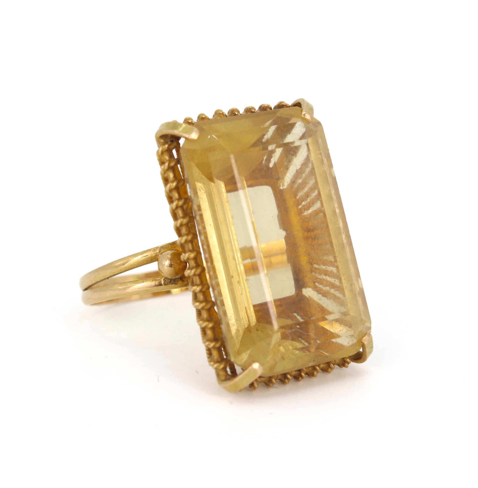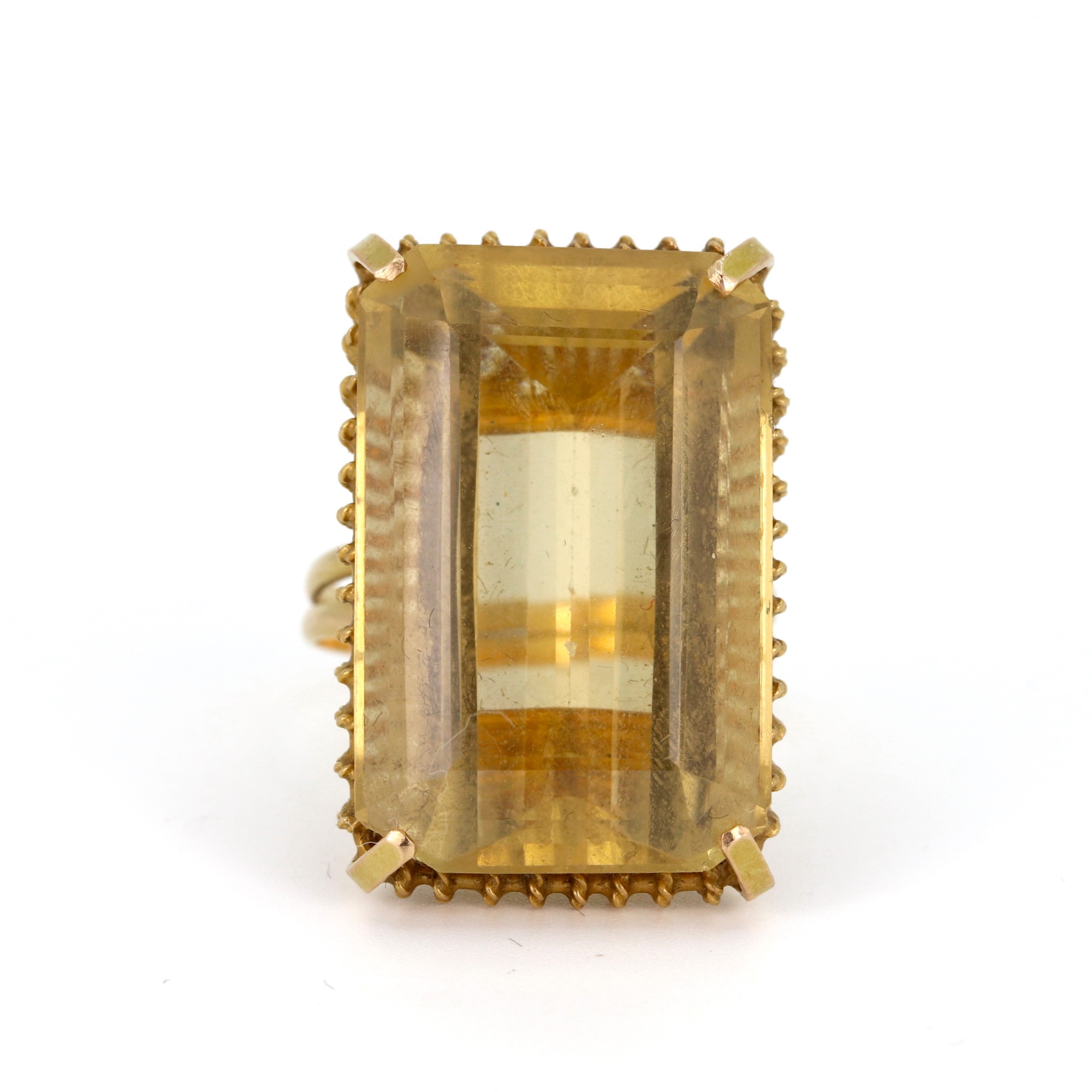 An 18K yellow gold ring set with large emerald cut citrine. Citrine 27ct approx.