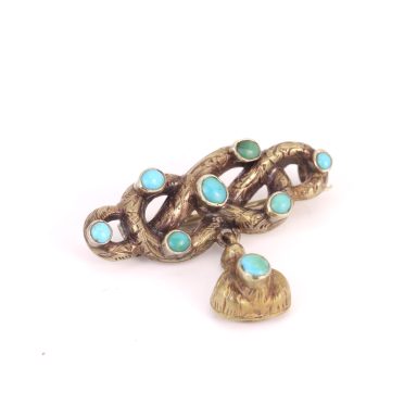 A 9K yellow gold brooch set with turquoise. Size: 2,5cm x 2cm.