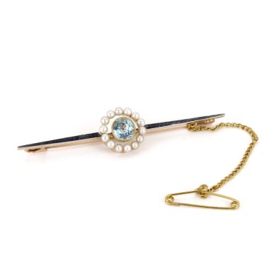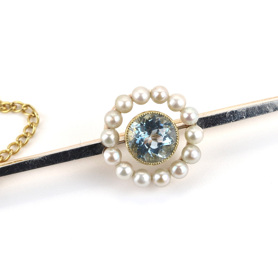 A 15K rose and yellow gold brooch set with round cut aquamarine surrounded by pearls.