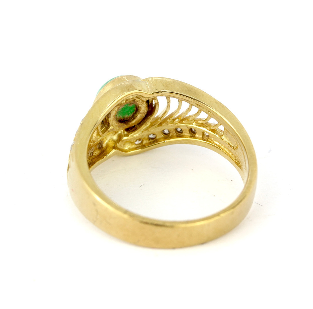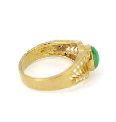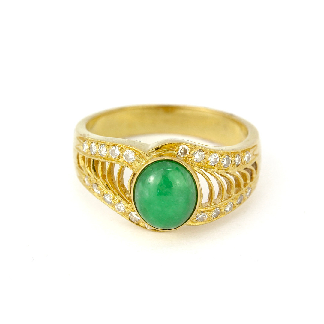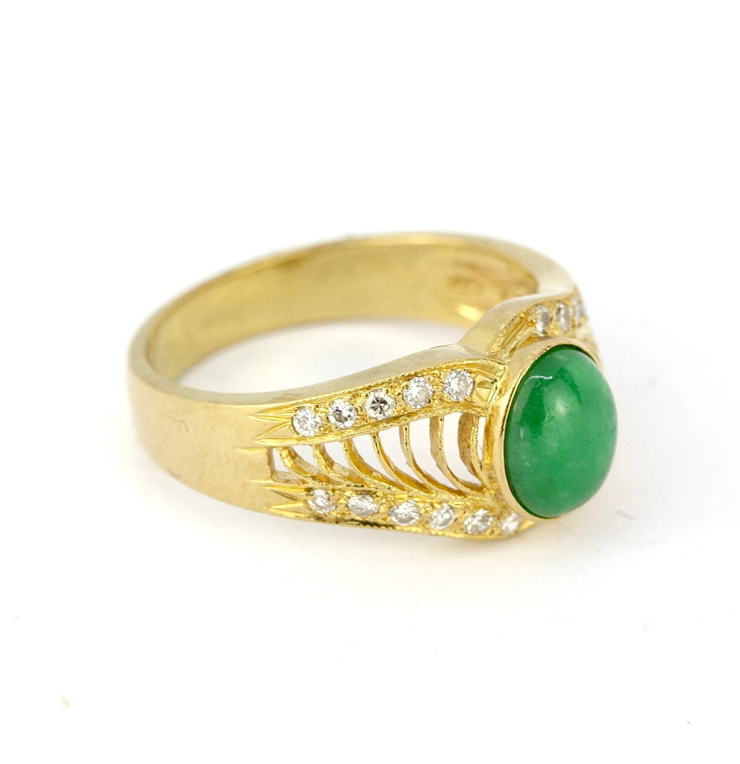 An 18ct yellow gold ring set with cabochon cut jade and diamonds on the shoulders. UK ring size: L,5. Total weight: 5,1g.