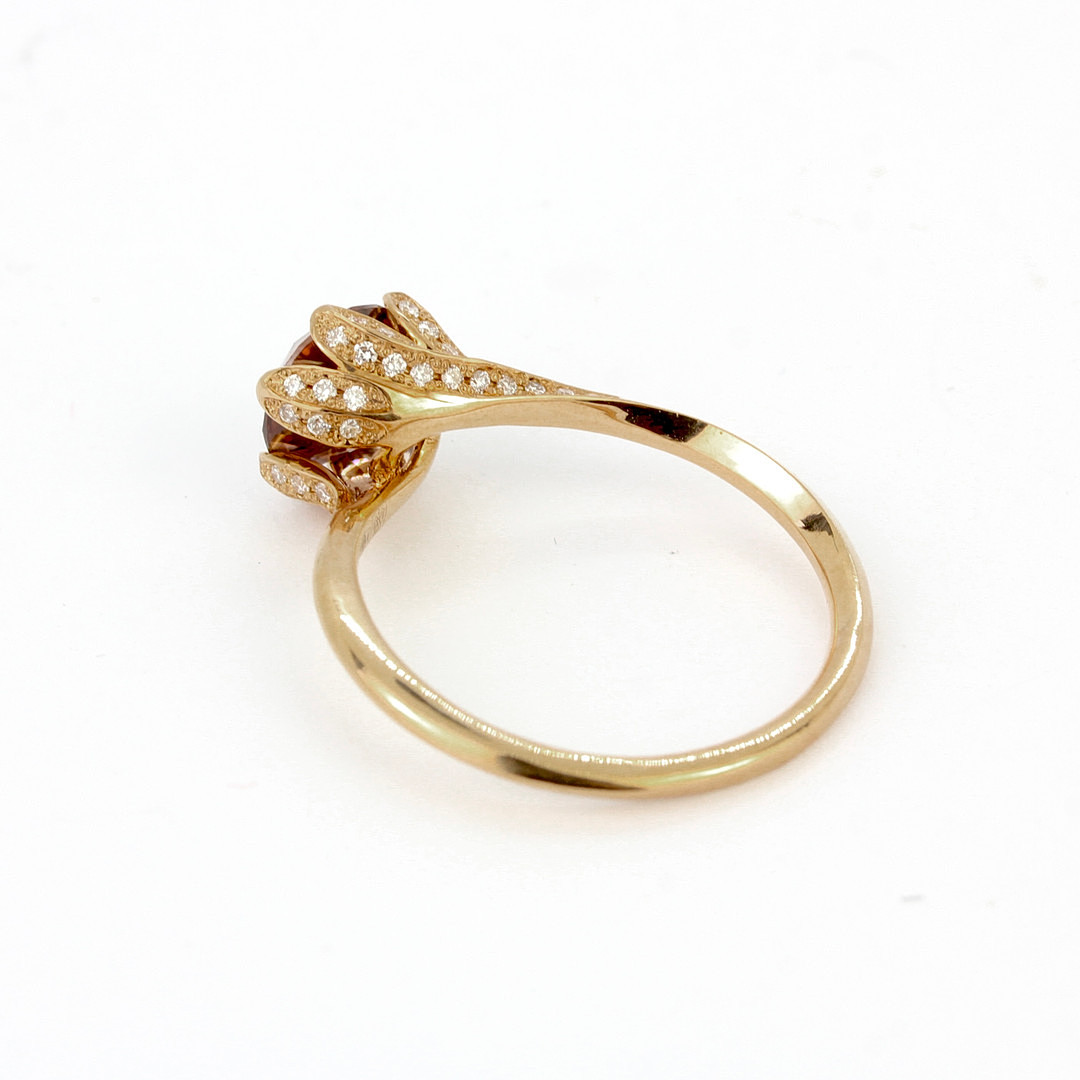 An 18ct rose gold ring set with large orange zircon (2,30ct cerified) surrounded by fifty diamonds (total approx. 0,5ct) UK ring size: Q. Total weight: 3,6g. Zircon certificate included.