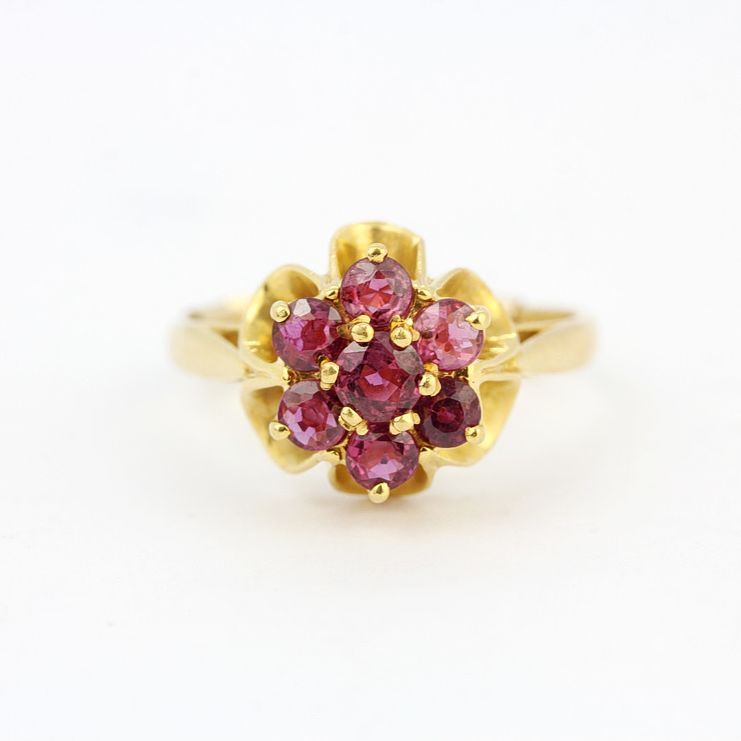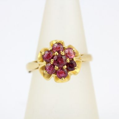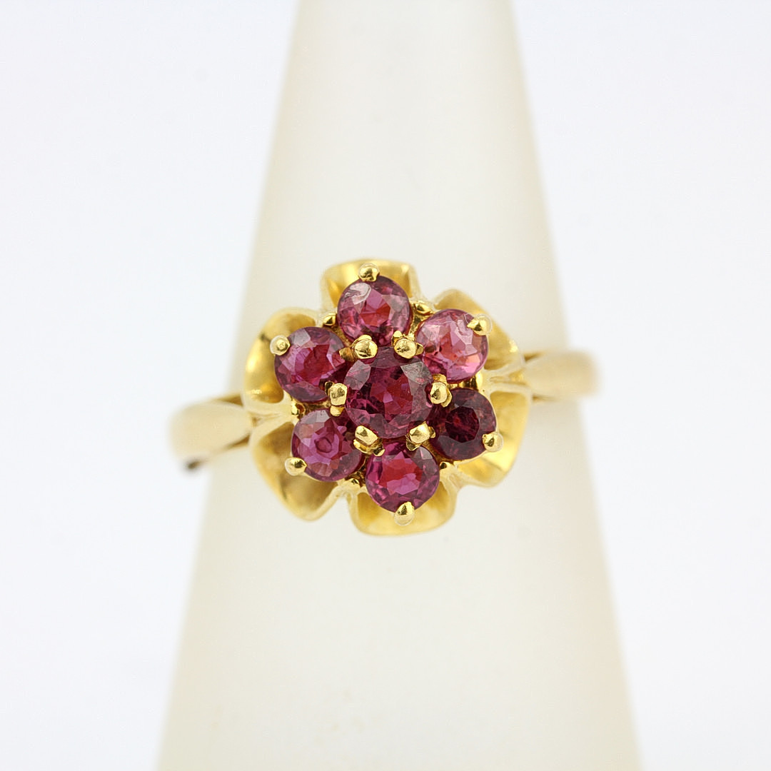 A 22ct yellow gold cluster ring set with pink sapphires by Christopher Gibson, Edinburgh, 1979. UK ring size: U.