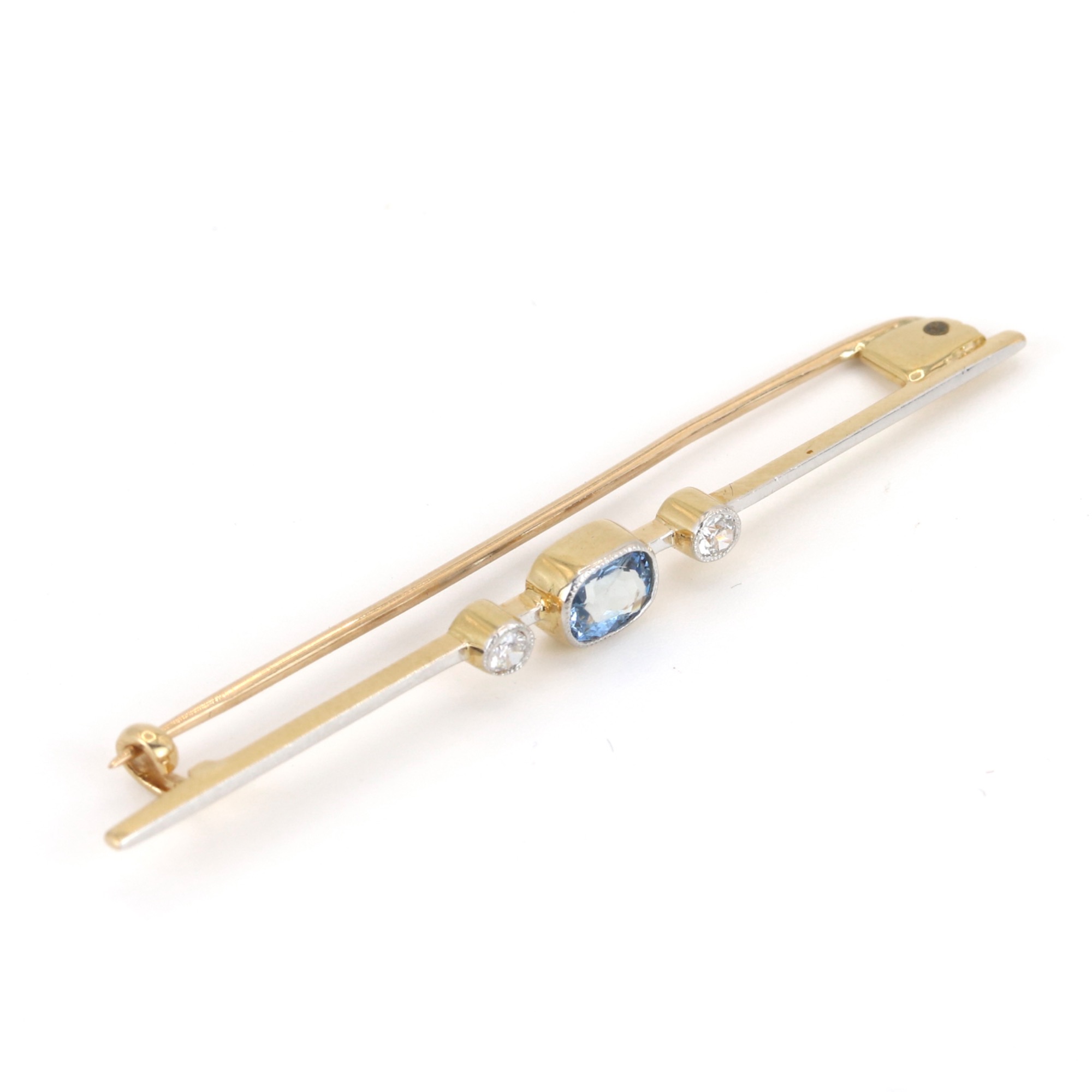 A 15K yellow gold brooch set with oval cut aquamarine and two brilliant cut diamonds.